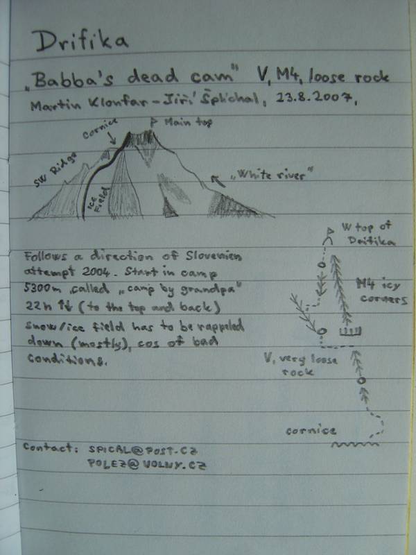 23.8. Ascent on Drifika (W-Top reached), in direction of slovenien attempt 2004, Babba’s Dead Cam, V M4 loose rock – Martin Klonfar, Jiri Splichal