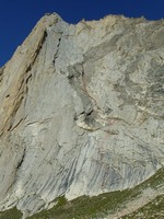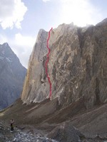12. a 18.8. Výstup na Denbor Brakk (4800m), Haulbag, Du Arschloch! / Trihedral Route 6c A1 (VII A2), 450m, 10délek