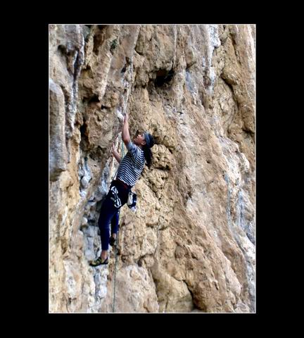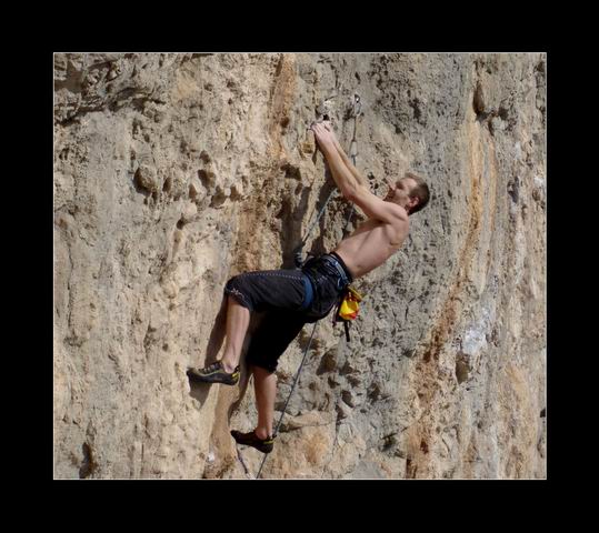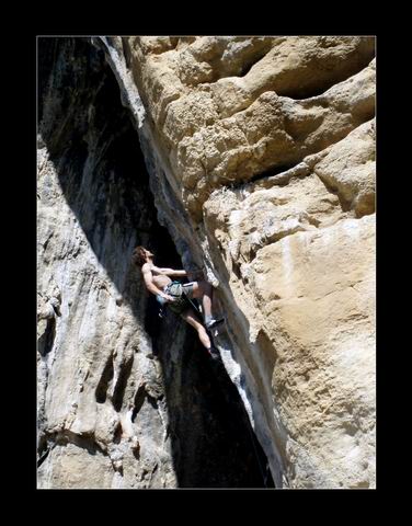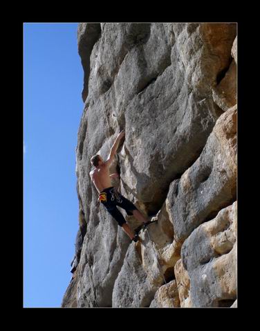 Počasí se umoudřuje. Stále se opakující kolotoč těžkého lezení a večerního polévání jazyku na mě zanechává stopy projevující se sílící únavou. Příjemné „letní" teploty a po jednom nekontrolovaném pádu rozbitá hlava a naražený záda mi dovolují alespoň trochu „zrelaxovat". Magnusek naproti tomu evidentně žádnou únavou netrpí a kosí jeden prásk za druhým. Ace Ventura (8a+) a Lourdes (8a) mu zaberou 3 pokusy. V Pepkovi (7c+/8a) pak padá těsně pod řetězem a ani v Smashing Pumkins (8a) mu k přelezu moc nechybí. Nespočet lehčích cest do 7c pak v jeho případě nemá cenu jmenovat. Ani Peklo se nechce nechat zahanbit a druhým pokusem tam posílá 7c, což je nejen na Turistický oddíl dost gut! A to ještě navrch přidává mistrovský výkon v podobě zpáteční cesty z Makina nejprve k tunelům, kde však číhá strážník, což znamená návrat do kopce a parádní vycházku skrz skalní okno... To Smrček s Remešem si evidentně přijeli pobyt patřičně užít a bez větších ambicí si vychutnávají všemožné radovánky, které Chorro nabízí.