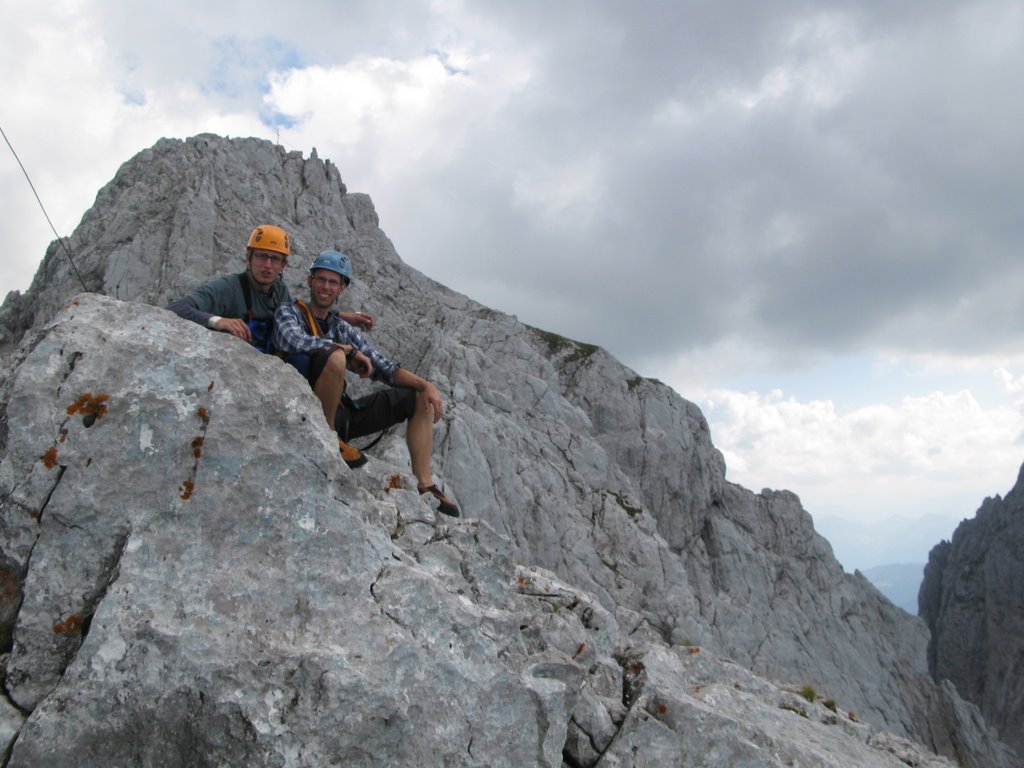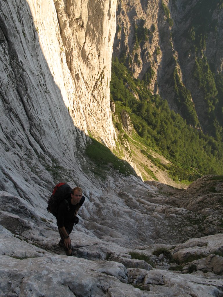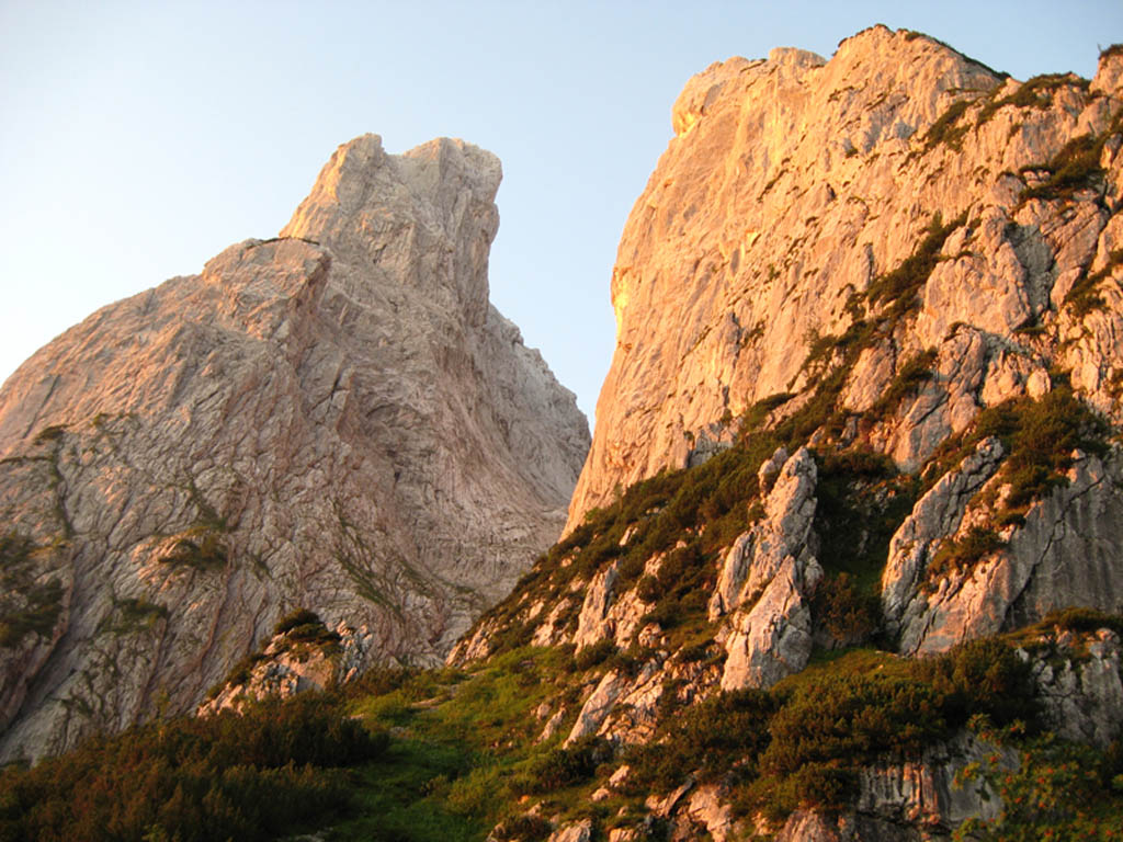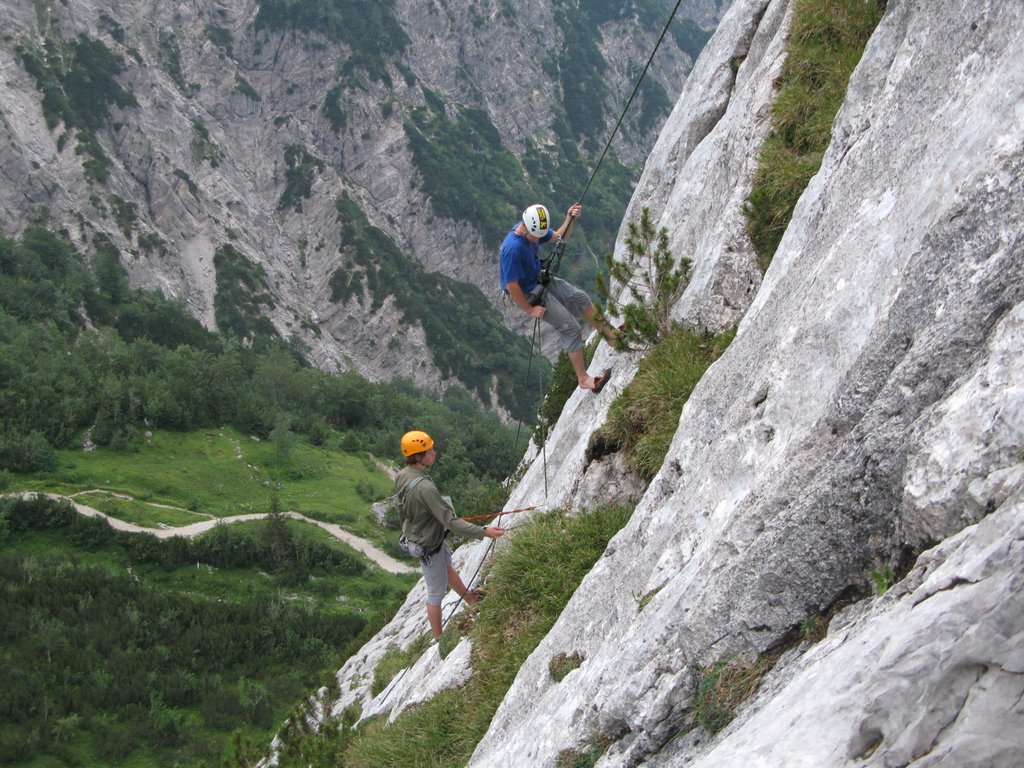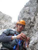 Hnáni nedočkavostí vrháme se lačně na každou odbočku, odvážně popolézáme přes rozlámané haluze, vždy až do chvíle než zjistíme že tudy to fakt nevede, ale což, aspoň se rozlezem. Po několika hodinách sme tam kde sme být chtěli, odhadujem že pod stěnu je to ještě sakra daleko (a taky že bylo) a raději se vracíme, abychom ráno brzo vstali. U auta ještě pročítáme průvodce, my s Jendou těsně před spaním vybíráme jinačí cestu než na kterou máme zálusk celý den, čímž Míru zneklidníme, ale Kryštof jako že „do píči klid a no stres“.Vstávačka o půl 5 (přece jen nejsme žádný zkušený lezouni a všecko nám trvá), po 5 naše dvojka vyráží, kluci sou o něco pomalejší, páč maj v plánu pak pod stěnou přespat aby nemuseli další den znova. Nástup je dlouhej tak, že tomu ani nemůžem uvěřit a pod stěnou sme až v 9.Jeden batoh necháváme (naštěstí) na poslední chvílí pod stěnou a nastupujem do Westkanty na Predigstuhl za V-, což se nám zdá na rozlez celkem rozumný. Kluci docházej chvíli po nás a vybíraj nějakou blbost vedle, ze který se pak 2 hodiny ozývá nadávání, zatloukání a vytloukání skob a pak že na to kašlou a jdou do nýtovaček. První problém nastává hned ve druhý dýlce, kterou se slovy „dyť má jen 20metrů“ spojuju se stejně dlouhou třetí, přičemž sem si neuvědomil, že ten štand tak hrozně vlevo tam je proto aby se dalo lízt poměrně lehkym, ale zato děsivě lámavym koutkem u hrany, akorát přesně nad prvnim štandem s nic netušícím a vesele pohvizdujícím jističem. Místo toho valim nepěknou, vlhkou spárou do který se mi nechce vejít žádnej frendík a nadávám jak dlaždič. Traverz do koutka se mi povede až dost vysoko, kde s ulehčenim zatluču skobu a už je to trošku veselejší. Pak už jen chvíle hledání štandu, a trošku zklamání, že na rozdíl od prvních dvou není vrtanej, ale tvořenej jen jednou starou skobou. Trochu ho vylepšuju a koukám na hodinky jak dlouho sem se tam zapráskal. Dlouho. Další dýlka je první za V-, komínek, s báglem na zádech se to leze blbě i na druháka, ale jde to. Další dýlka ja psaná jako že „Schlüssel“, taky V-. Nastupuju, dávám blbej vklíněnec, kterej skoro hned vypadne, malej friend a koukám nad sebe na mírně převislou spáru a pak pod sebe na velký kotníkový lezečky ala Robin Hood a přemejšlim jak to kolem odšlapat a dolízt aspoň k tý skobce zatlučený furt dost vysoko nade mnou. Po pár neslušnejch slovech jí cvaknu a i když nevypadá nijak závratně, pokračuju chytovatou spárou co sakra tahá za ruce dál, trochu udiven jak že to tady maj ty V- jako že teda pěkně těžký, že budu muset víc trénovat. Nad spárou už je nejt a trochu se to pokládá, tak ještě pár těžších kroků a pěknej dolez k vrtanýmu štandu pod převískem. Sváča, obdivování větroně kterej se proletí údolím mezi horama a už nám zbejvaj jen 2,5 lehkejch dýlek, který už nechávám Jankovi, aby si taky zalez a nemusel tahat bágl. Nahoře sme kolem 4 (trvalo nám to jen 2,5x dýl než je psáno v průvodci) a panorámata sou parádní. Koukáme na naše drandidlo, poslušně na nás čekající na parkále a sníme o paraglidu a krásnym a snadnym sestupu.(29) Místo toho nás čeká trojí slanění komínem, přičemž před poslednim mi vypadne Guide z ruky a s cinkotem mizí v komíně. Sice s vědomím, že sme v kraji Dülfera ale oblečen v elasťáky, vyhrává u mě slanění na půlloďáku a dole milé shledání s trochu otlučeným guidem. Chvíli přemejšlim jestli ho nevyhodit, ale věren Schubertovu zkoumání, že mikrotrhliny sou blbost a ubezpečujíc se, že na tom vlastně není stejně žádná pořádná váha cvakám ho zpět na sedák. Dole koukáme na ten dlouhej sestup a vůbec se nám do něj nechce, ale co naděláme, když sem si nevzali spací věci jako kluci. Trošku frajírkovsky slejzáme ferátkama bez helmy, ale jen do chvíle než nám kolem hlavy prosviští pár šutráku, shozenejch ňákejma……který ani neuměj zakřičet jako že „štajn“ nebo cokoli jinýho, ale sere pes, nemá cenu se rozčilovat, že jo. Na nejtovačkách se potkáváme s klukama, kteří mění plán a jdou s náma taky k autu, asi maj chuť na pořádnej dlabanec, heh. Druhej den nejsme úplně ve formě na ty dlouhý nástupy, tak jdem popolejzat jen do vynejtovanejch dvoudýlek, další den, jakožto kritickej třetí je resťáček, zakoupili sme místní špek, cpem se co to dá a osnujem plány na zítřek. Ty nám trošku kazí několik hodin noční buřiny, ráno to taky nevypadá nijak slavně, skály mokrý, vypadá to spíš na houby než na lezení, ale přece jen se vydáme najít aspoň nějaký nýtovačky, tentokrát sme optimisti my s Honzou že nahoře někde přespíme a něco pořádnýho vylezem zítra. Nějaký nejtovačky by byly, ale skoro zároveň s nástupem se spouští lijavec, ještě chvíli to pokoušíme, ale pak už to není lezení ale klouzání a plavání, tak to balíme a sestupujem.Tentokrát Míra s Kryštofem rychlejc, páč sou na lehko, my se ještě usazujem na zápraží u chaty a dlabem, což se ukáže jako dobrej tah, páč déšť aspoň chvílema ustává, tak se přeci jen vydáme vylízt ještě nějaký 2-3 dýlky na pořádně mokrym, trénink je trénink a kdoví jak bude zejtra.