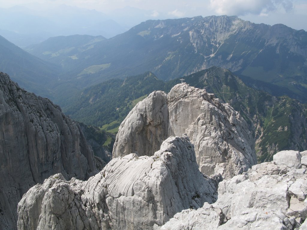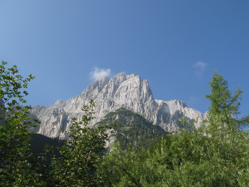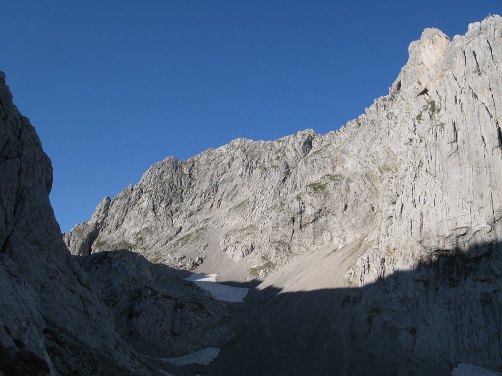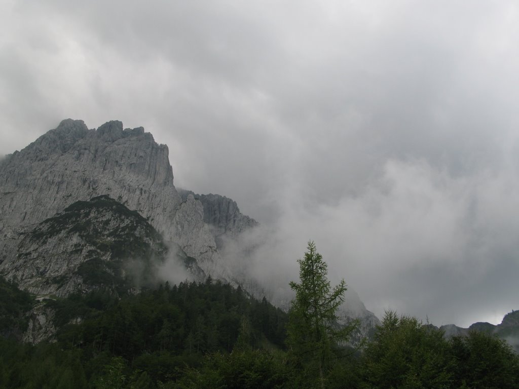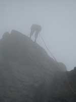Hnáni nedočkavostí vrháme se lačně na každou odbočku, odvážně popolézáme přes rozlámané haluze, vždy až do chvíle než zjistíme že tudy to fakt nevede, ale což, aspoň se rozlezem. Po několika hodinách sme tam kde sme být chtěli, odhadujem že pod stěnu je to ještě sakra daleko (a taky že bylo) a raději se vracíme, abychom ráno brzo vstali. U auta ještě pročítáme průvodce, my s Jendou těsně před spaním vybíráme jinačí cestu než na kterou máme zálusk celý den, čímž Míru zneklidníme, ale Kryštof jako že „do píči klid a no stres“.Vstávačka o půl 5 (přece jen nejsme žádný zkušený lezouni a všecko nám trvá), po 5 naše dvojka vyráží, kluci sou o něco pomalejší, páč maj v plánu pak pod stěnou přespat aby nemuseli další den znova. Nástup je dlouhej tak, že tomu ani nemůžem uvěřit a pod stěnou sme až v 9.Jeden batoh necháváme (naštěstí) na poslední chvílí pod stěnou a nastupujem do Westkanty na Predigstuhl za V-, což se nám zdá na rozlez celkem rozumný. Kluci docházej chvíli po nás a vybíraj nějakou blbost vedle, ze který se pak 2 hodiny ozývá nadávání, zatloukání a vytloukání skob a pak že na to kašlou a jdou do nýtovaček. První problém nastává hned ve druhý dýlce, kterou se slovy „dyť má jen 20metrů“ spojuju se stejně dlouhou třetí, přičemž sem si neuvědomil, že ten štand tak hrozně vlevo tam je proto aby se dalo lízt poměrně lehkym, ale zato děsivě lámavym koutkem u hrany, akorát přesně nad prvnim štandem s nic netušícím a vesele pohvizdujícím jističem. Místo toho valim nepěknou, vlhkou spárou do který se mi nechce vejít žádnej frendík a nadávám jak dlaždič. Traverz do koutka se mi povede až dost vysoko, kde s ulehčenim zatluču skobu a už je to trošku veselejší. Pak už jen chvíle hledání štandu, a trošku zklamání, že na rozdíl od prvních dvou není vrtanej, ale tvořenej jen jednou starou skobou. Trochu ho vylepšuju a koukám na hodinky jak dlouho sem se tam zapráskal. Dlouho. Další dýlka je první za V-, komínek, s báglem na zádech se to leze blbě i na druháka, ale jde to. Další dýlka ja psaná jako že „Schlüssel“, taky V-. Nastupuju, dávám blbej vklíněnec, kterej skoro hned vypadne, malej friend a koukám nad sebe na mírně převislou spáru a pak pod sebe na velký kotníkový lezečky ala Robin Hood a přemejšlim jak to kolem odšlapat a dolízt aspoň k tý skobce zatlučený furt dost vysoko nade mnou. Po pár neslušnejch slovech jí cvaknu a i když nevypadá nijak závratně, pokračuju chytovatou spárou co sakra tahá za ruce dál, trochu udiven jak že to tady maj ty V- jako že teda pěkně těžký, že budu muset víc trénovat. Nad spárou už je nejt a trochu se to pokládá, tak ještě pár těžších kroků a pěknej dolez k vrtanýmu štandu pod převískem. Sváča, obdivování větroně kterej se proletí údolím mezi horama a už nám zbejvaj jen 2,5 lehkejch dýlek, který už nechávám Jankovi, aby si taky zalez a nemusel tahat bágl. Nahoře sme kolem 4 (trvalo nám to jen 2,5x dýl než je psáno v průvodci) a panorámata sou parádní. Koukáme na naše drandidlo, poslušně na nás čekající na parkále a sníme o paraglidu a krásnym a snadnym sestupu.(29) Místo toho nás čeká trojí slanění komínem, přičemž před poslednim mi vypadne Guide z ruky a s cinkotem mizí v komíně. Sice s vědomím, že sme v kraji Dülfera ale oblečen v elasťáky, vyhrává u mě slanění na půlloďáku a dole milé shledání s trochu otlučeným guidem. Chvíli přemejšlim jestli ho nevyhodit, ale věren Schubertovu zkoumání, že mikrotrhliny sou blbost a ubezpečujíc se, že na tom vlastně není stejně žádná pořádná váha cvakám ho zpět na sedák. Dole koukáme na ten dlouhej sestup a vůbec se nám do něj nechce, ale co naděláme, když sem si nevzali spací věci jako kluci. Trošku frajírkovsky slejzáme ferátkama bez helmy, ale jen do chvíle než nám kolem hlavy prosviští pár šutráku, shozenejch ňákejma……který ani neuměj zakřičet jako že „štajn“ nebo cokoli jinýho, ale sere pes, nemá cenu se rozčilovat, že jo. Na nejtovačkách se potkáváme s klukama, kteří mění plán a jdou s náma taky k autu, asi maj chuť na pořádnej dlabanec, heh. Druhej den nejsme úplně ve formě na ty dlouhý nástupy, tak jdem popolejzat jen do vynejtovanejch dvoudýlek, další den, jakožto kritickej třetí je resťáček, zakoupili sme místní špek, cpem se co to dá a osnujem plány na zítřek. Ty nám trošku kazí několik hodin noční buřiny, ráno to taky nevypadá nijak slavně, skály mokrý, vypadá to spíš na houby než na lezení, ale přece jen se vydáme najít aspoň nějaký nýtovačky, tentokrát sme optimisti my s Honzou že nahoře někde přespíme a něco pořádnýho vylezem zítra. Nějaký nejtovačky by byly, ale skoro zároveň s nástupem se spouští lijavec, ještě chvíli to pokoušíme, ale pak už to není lezení ale klouzání a plavání, tak to balíme a sestupujem.Tentokrát Míra s Kryštofem rychlejc, páč sou na lehko, my se ještě usazujem na zápraží u chaty a dlabem, což se ukáže jako dobrej tah, páč déšť aspoň chvílema ustává, tak se přeci jen vydáme vylízt ještě nějaký 2-3 dýlky na pořádně mokrym, trénink je trénink a kdoví jak bude zejtra.