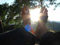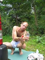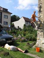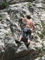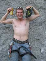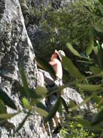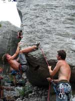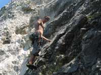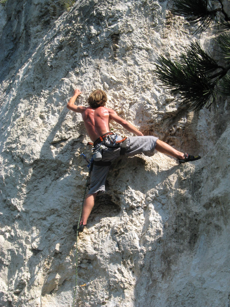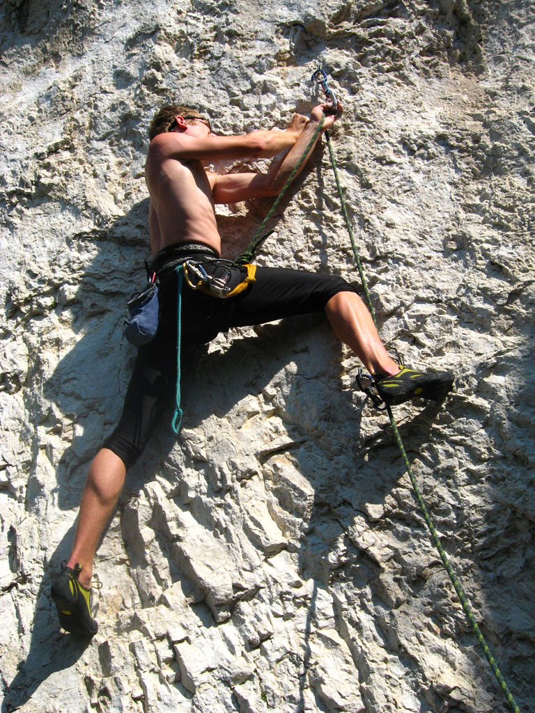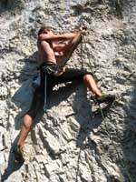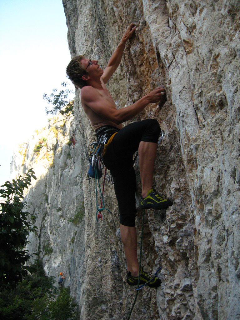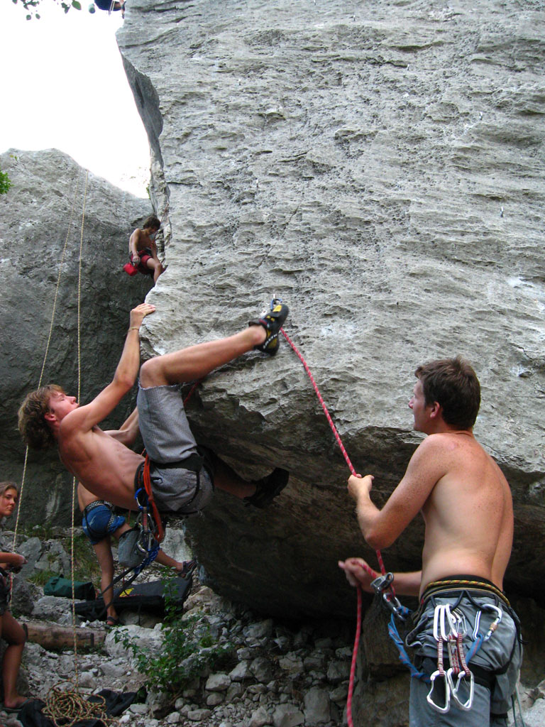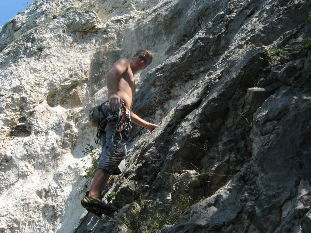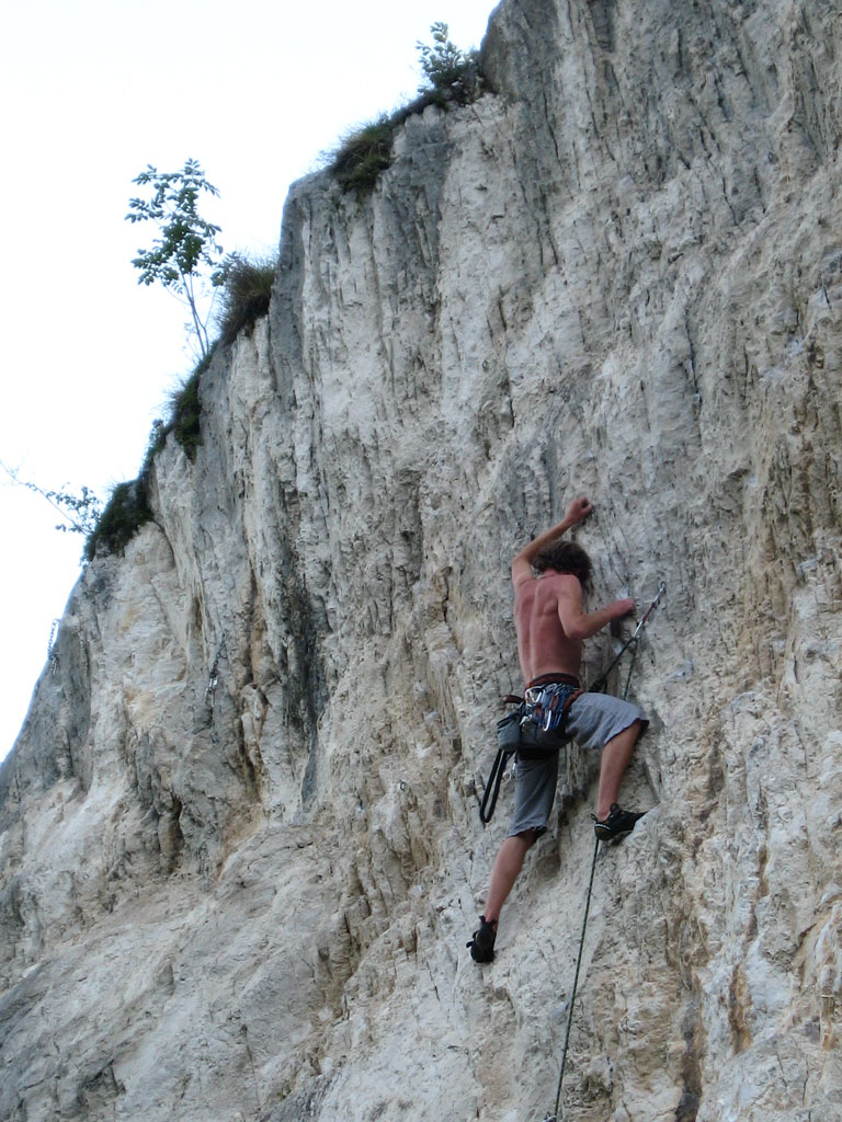 Bylo blbě, tak balíme, doháníme zlíňáky, překládáme k nim Jendu, kterej musí do Prahy a ve třech se vydáváme vstříc sluníčku, koupání a nejtovačkám. Stop u Innsbrucku v Mekáči, párkrát obejít stoly jesli ňáký děcka nenechaj něco málo hranolek, najíst se cheeseama a hurá skrz Brenner, K.H.B., Trento do Arca. Chvíle bloudění, hledání místečka na zakempení a pohůdka, olivovej háječek, kus dál řeka a pitná voda, co chtít víc? Ráno obcházíme shopy s vidinou levnýho nákupu, jak nám o tom všichni vyprávěli, ale ouha, všecko je drahý jako u nás, snad jen BD presa sou o něco levnější, ale cena furt převyšuje naší touhu je vlastnit. Průvodec kupovat nechcem, tak vyzvídáme od prodavačů kam jet, opisujem si cestu a doufáme, že někdě potkáme lezce a průvodec ofotíme. Jedem do Val Lomassone, je to z Arca trochu z ruky, ale zas je na parkále místní průvodčík free, což se hodí. Klasifikace je tam hodně mírnější než jinde, na rozlez procházkový 6a, který na konci, po zkušenostech s mnoha jinejma nelezitelnejma 6áčkama odhadujem tak na 5b. Vápno hodně žere lezky, tak je hned první den prodřu, pročež musíme jít nakupovat. Sem trochu překvapen že v tak lezeckym městě maj tak málo lezeček, buď šunty, nebo mi nesedí a většinou maj velikosti tak do 38 a pak od 45. Nakonec končíme u LS, kde sou zásobený, ale o to dražší a fakt „no student discount“. Ale což, šetříme za kemp a lízt se musí. Zakoupíme i průvodec a najíždíme na celkem příjemnej monotónní rytmus – snídačka, lezení, koupačka, lezení, večeře, vínko, koupačka v řece a spát. Objíždíme Belvedere, Massone, Massi di Prabi, San Paolo a Nago, kde se nám asi líbí nejvíc, proto tam zajíždíme hned dvakrát, lezeme, snažíme se, často to nejde, nadáváme na klasifikaci, ale občas se zadaří a nějaký aspoň 6b+ padnou. Tak představovali sme si trochu víc, to je jasný, ale holt nejsme žádný sportovní lezci na který občas čumíme s otevřenou pusou, ale jak říká Míra „bych je chtěl vidět na písku nebo v mixech“. Poslední odpoledne lezem už jen s Mírou, páč Kryštof se tváří tajemně, že prej má ještě nějakou prácičku, co by si potřeboval tady v itálii splnit a řádně omyt, oholen a navoněn se vydává do města. Nakonec se ukáže, že se jen chtěl jít podívat na hrad, dát si pizzu a zmrzku. Tak se mu trošku smějem, ale jako cajk, bylo to hodně fajn. Večer pak trošku popijem, naštěstí bez Míry, kterej jde jako zodpovědnej řidič spát a po pár flaškách levnýho vína a trošce spánku Mírovi vracíme jeho odjezdovou indispozici a ráno se ještě vožralý hrnem do auta a necháme se vézt. V Innsbrucku u mekáče repete, před rozvadovem s poslednim půllitrem benzínu poslední drama jestli to k benzínce dáme nebo ne (dali) a hurá domů. Druhej den vybalujema uklízíme auto a když se naložim, aby mě Míra s těma tunama věcí hodil domu, tak ne a ne naskočit motor. Chvíli koukáme jak puci, pak se smějem, je prostě klika, že se to po… teprv doma. Nejvíc punk je prostě u Míry na zahradě. Ciao