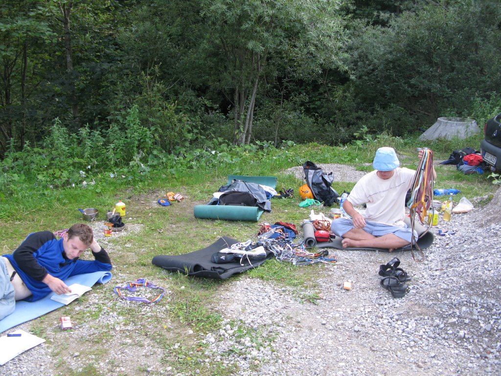 Plán zněl dobře, 2-3 týdny alpy s restem na skalkách u vody, málokdo by odolal. Pár dní odsouvání odjezdu, nakonec vyhrává středa ráno (po Bulwě, pche!) v 9 u Míry. Dotrousili sme se postupně mezi 11 až 12 a už od vrátek každej při pohledu na Míru válejícího se u auta, objímajícího kyblíček, kterej intermitentně plní zbytky žaludečního obsahu cejtí, že to není úplnej cajk.Holt snaha přepít italy se Mírovi krutě nevyplatila. S nadějí, že se třeba dá někdy do pořádku, necháváme ho odpočívat a radši si prohlížíme tu mrňavou káru co nás má odvézt a tu ohromnou hromadu věcí co se do ní má naložit. Po několikerém přebrání věcí („tak tohle preso teda neberu a tenhle prusík tu taky nechám“), přebalení, popůjčování zbylých průvodců, pár partičkách kroketu, se sluncem již nevysoko nad obzorem, doprovázeni Mírovými slovy „bez flašky bezinkovýho sirupu nikam nejedu“ se šťastně městnáme do auta a vyrážíme směr Kaiser. Auto podvozkem skoro ležící na zemi jede i na naftu od Tank ONO Nýřany (23,50kč/l) po dálnici 120km/h, což je krása, tak už kolem jedný ráno dojíždíme na parkál u chaty Griesner Alm, navíc potěšeni tim, že v noci se dole nevybírá poplatek za silnici (2,50e), sme přece češi. Páč po takovym výkonu se i poctivě trénující lezec unaví, spinkáme pěkně do 9, cpeme se, studujeme průvodce a až odpoledne se vydáváme prozkoumat nástupy na další den.