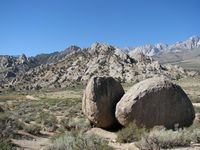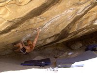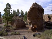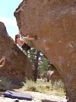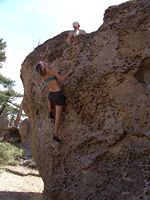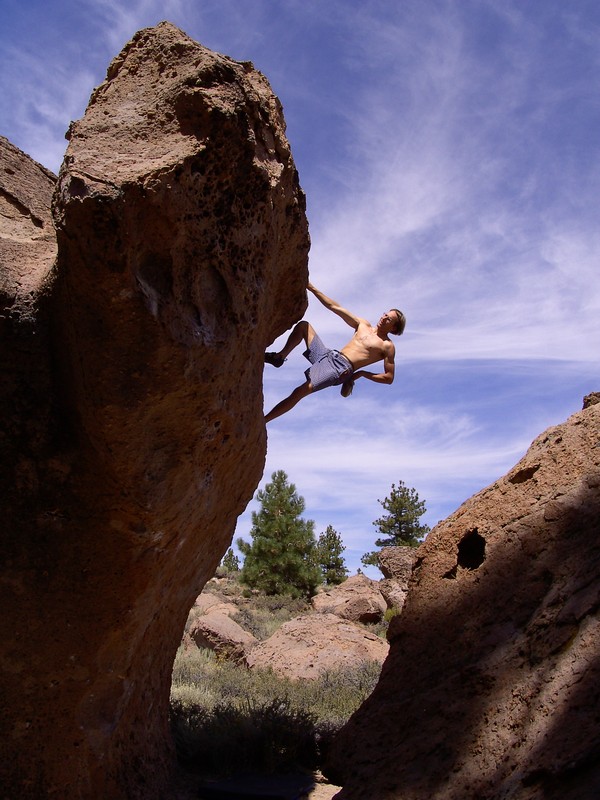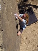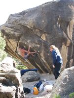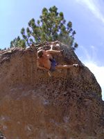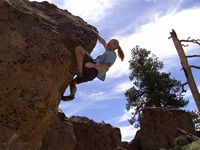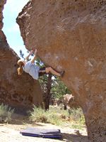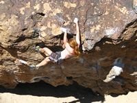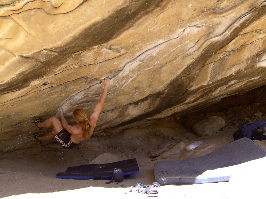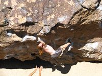 Od LA půl dne jízdy, v bouldrovém světě obrovský pojem, mega oblast srovnávaná s Fontainebleau. Dva druhy materiálu (sopečný tuf a žula), zasněžené hory v okolí (v zimě), přírodní horké prameny ideální pro večerní relaxaci (zejména v zimě). Bohužel, v době naší návštěvy koncem září pochopitelně panovaly „stovky“ (stupňů Farenheita), takže o ideálním tření nemohla být řeč. Lezli jsem jen po ránu a večer, nicméně dalo se. Skvělý program na přečkání poledního megavedra je veřejný bazén v městečku a travnatý park v jeho okolí (hned vedle Visitor’s centra). Tuf v Happy a Sad boulders je chytovatý, ale dost porézní a ostrý, kůže dostává pěkně zabrat. Stupnice relativně přívětivá, neboť tento charakter lezení našinci vyhovuje (něco mezi Jurou a pískem). Naopak žula v Buttermilkách je nekompromisní, kůži žere taky fest a i lehký bouldry jsou krutý, nic pro zewláky. Subjektivně V1 v Buttermilkách mi přišlo jak V4 na tufu ;-) K Bishopu ovšem patří i mnoho satalitních oblastí, z nichž se nám dost líbila Desplomancia (snad jsem ten název moc nezkopal). Už její najití dle průvodce je dobrodružství samo o sobě, ale rozhodně stojí za to viz. fotky.