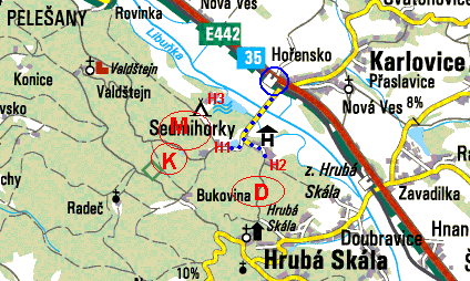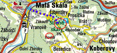 Karlovice-Sedmihorky (na mapce modrý kroužek) a po modrých tečkách do skal.