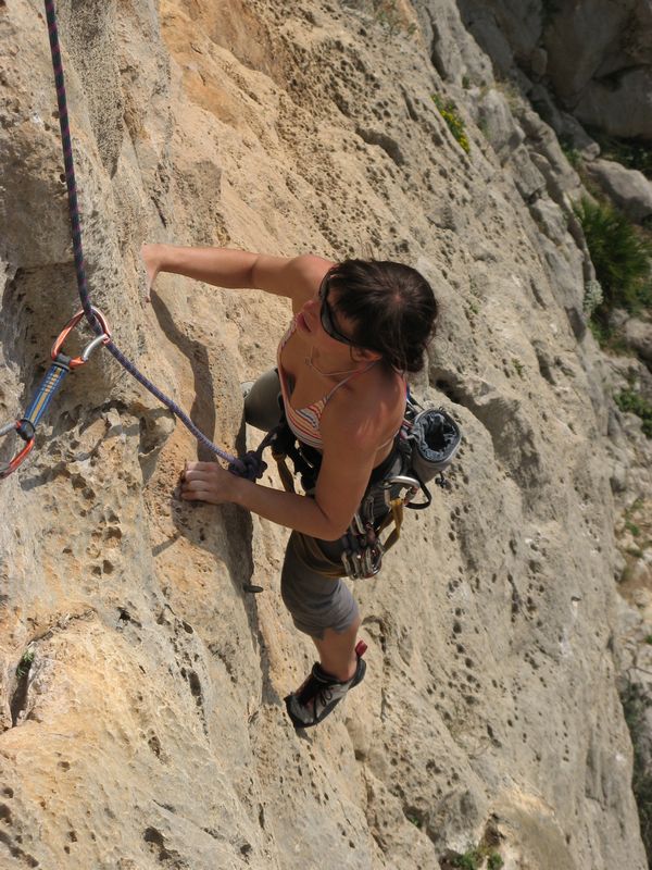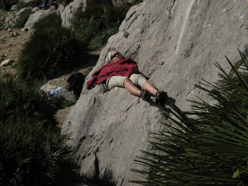 Poslední den chcem lízt s Evou, tak nám Bery doporučí krásnou výcedýlkovku. Dokonce nám od stanů ukáže nástup. Škoda, že se sekl o sektor. Po menšim bloudění a většim nadávání nacházíme cestu pomocí průvodce, bohužel v ní už operujou tři dvojky. Tak se jdem rozlízt do jednodýlkovek. Po návratu jsou u prvního štandu dva němci. Když vidíme, jak je druholezkyně šikovná, dáváme jim hodinu náskok a opalujem se. Pak se do toho pouštíme i my. Za dobu, co dáme tři dýlky, daj němci sotva jednu. Navíc nás bombardujou expreskama, co jim furt padaj. Tohle nemá cenu, naštvaně slaňujem a jdem radši balit.
