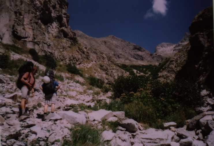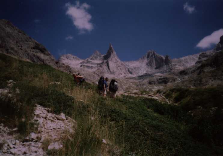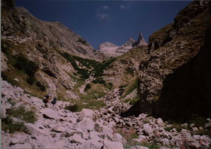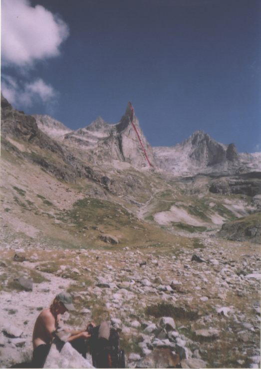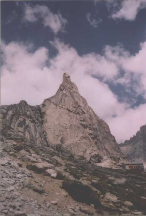 Další den opět azúro, vypadá to na pěknej pařák. Přebalujeme a vyrážíme k chatě Refuge du Soreiller (2719). Procházíme celkem pěkným úzkým kaňonem nebo jak tomu říct, kolem bezva potůčku a najednou se nečekaně objeví neuvěřitelná jehla. Čumíme jak puci, foťáky cvakaj, tak tam jdeme, to je super.