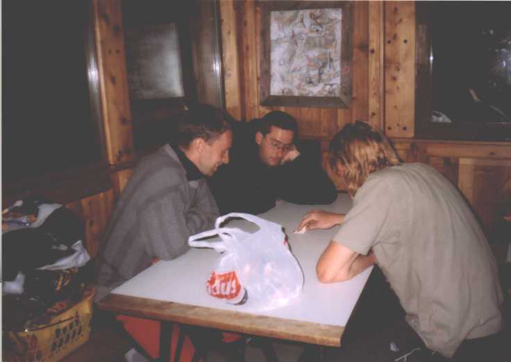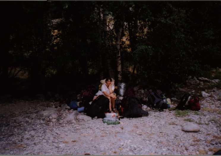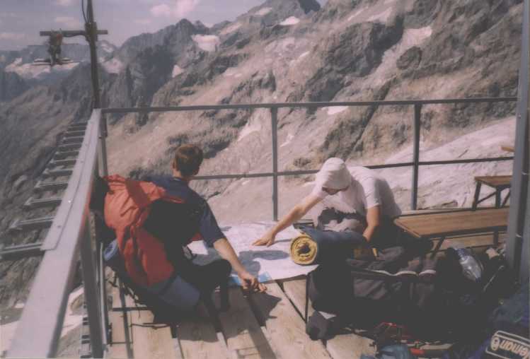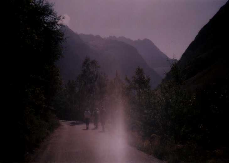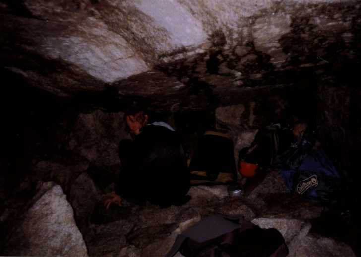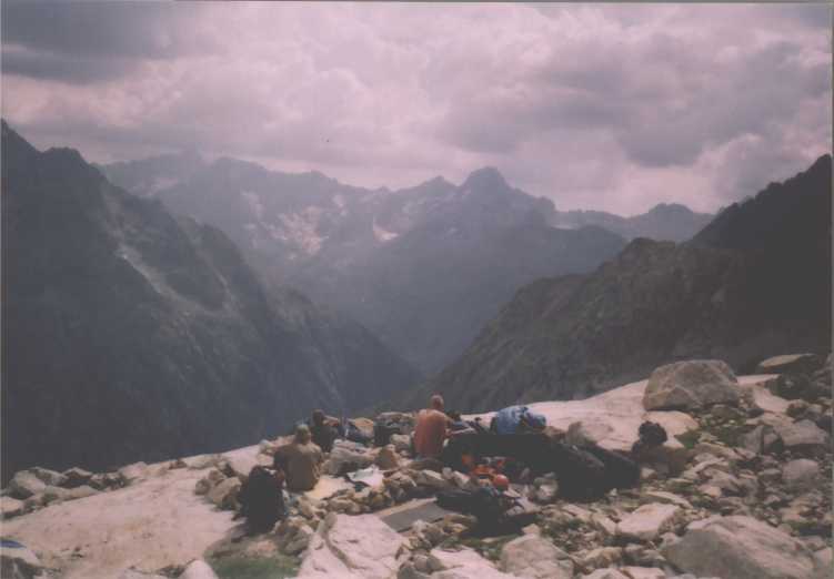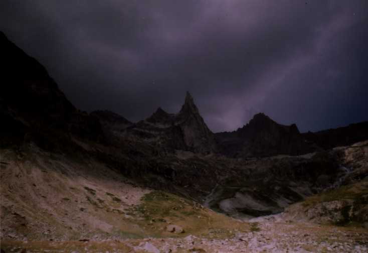 Balvan bohužel není převislý dost, takže po něm stejně stékají cestičky vody a kapou všude a na všechno, je hnusně, deprese. Chvíli nám trvá, než si uvědomíme, že zvuk, kterej slyšíme asi nemá nic společnýho s hromama, ani s žádnym vrtulníkem. Z potůčku dvě stě metrů východně od nás se stala menší řeka, která nese neuvěřitelný množství kamenů, a bere je až do údolí, samozřejmě kaňonem kudy jsme přišli a tedy cestou kudy museli scházet kluci. Nezdá se že by kterýkoliv z probíhajících dějů chtěl skončit, nakonec to takto probíhá asi dvě hodiny. Potom déšť poleví a my se jdem podívat k chatě. Janice i Vanki jsou už ubytovaný, nám se však platit 16 euro nechce, naštestí je přímo u chaty ideální bivakovací místečko. Nad dolinou a kaňonem lítá vrtulník, obáváme se o ostatní, díky naší francouzštině nejsme příliš schopni zjistit jestli se někomu něco nestalo, ale pak nám nějak dojde, že cesta dolů je zničená, kamenotok sebral lávky a tak. Noc je samozřejmě jasná, nálada už je horší.