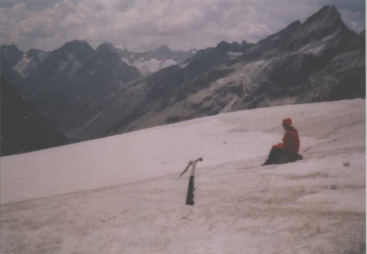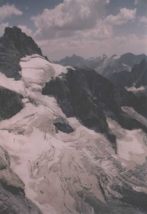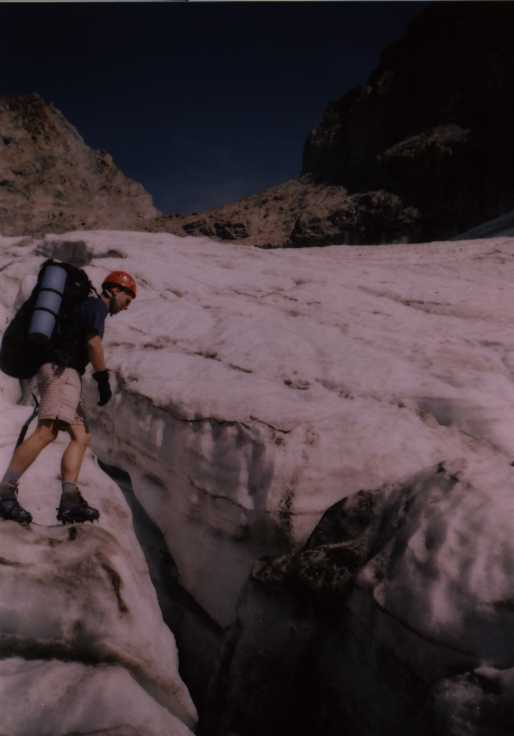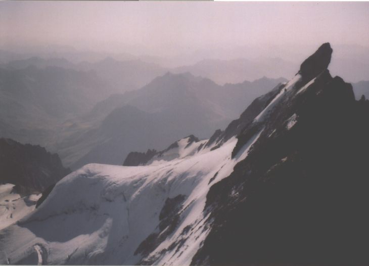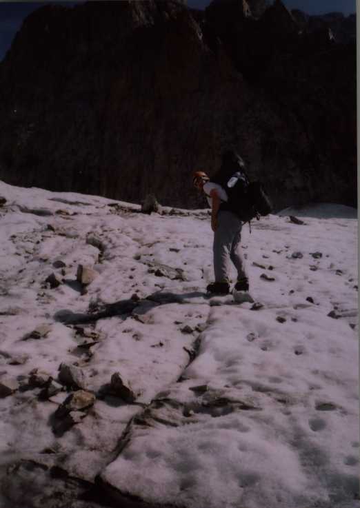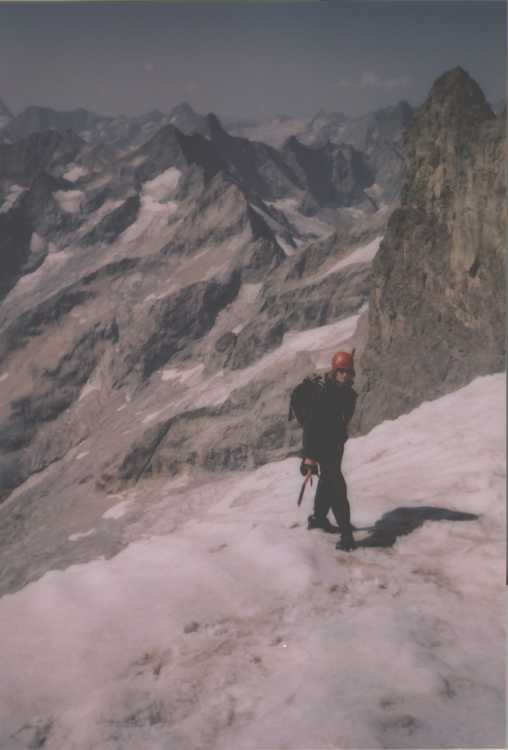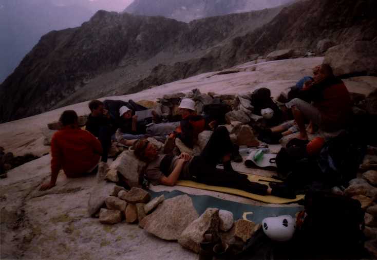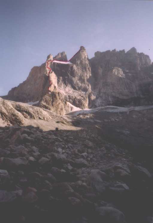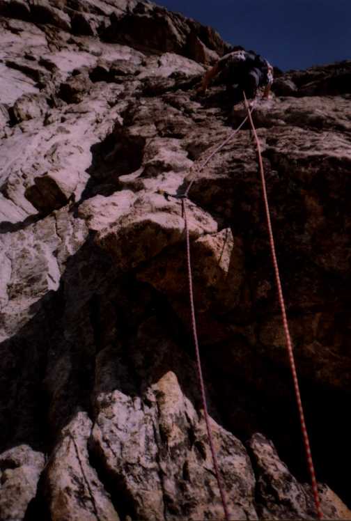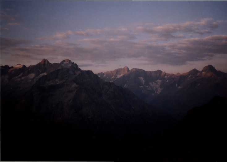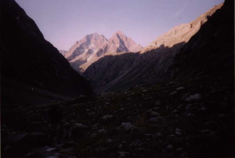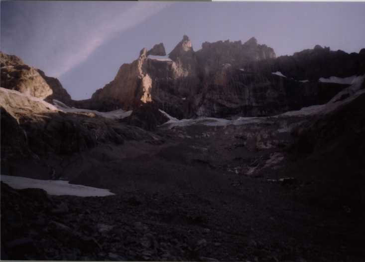 Je to neuvěřitelný, ale fakt vstáváme ve tři, lehká "snídaně", čelovky a jde se na věc. MagdaLenka má cestu celkem nastudovanou, stejně ale není tak lehký se v tý tmě orientovat. Jistit zatím není třeba, začínají nás dohánět nějaký tři lidičky, snad Španělé, docela jim to jde, ten co je vede to tady evidentně zná. Zdá se, že jsme se taky našli, lezení už ale začíná bejt vážnější a exponovaný a přirozeně mokrý. Aspoň že už je celkem světlo. Pouštíme před sebe trojičku, ten co vede se ani nejistí, jenom ty dva najednou dobírá na štandech. Zatím se asi na dvě zajímavější délky navážeme, přec jenom je to III+ a sklouznout by se dalo snadno. Konečně dolézáme k malému ledovci, který končí slušnou šluchtou. Takže mačky, no prostě bezva. Aklimatizace na Diboně byla asi dostačující, výška se moc neprojevuje, poslední úsek už je zase po skále. Těsně před vrškem opět doháníme Španěly, ještě jeden těžší kousek a jsme na vrcholu.