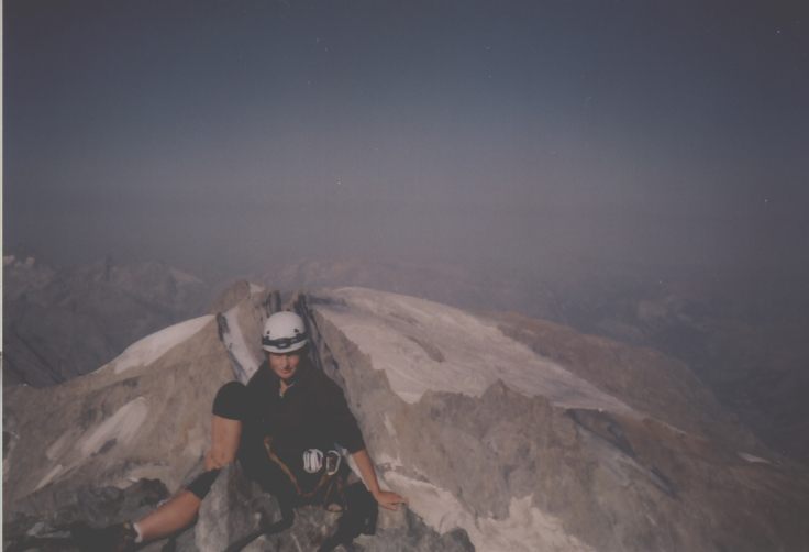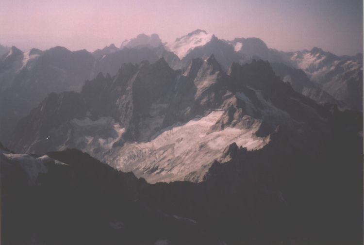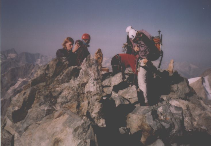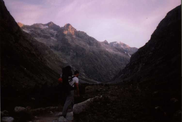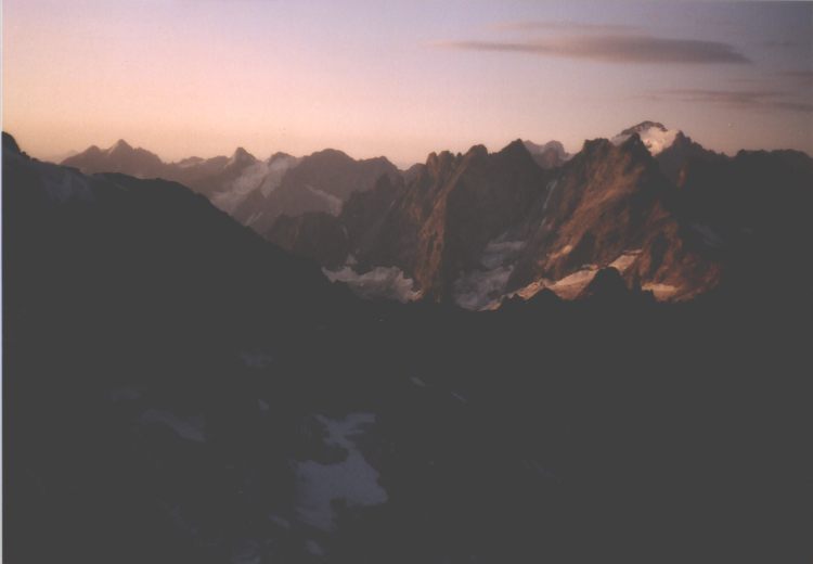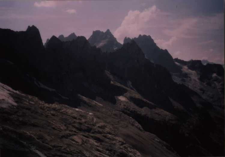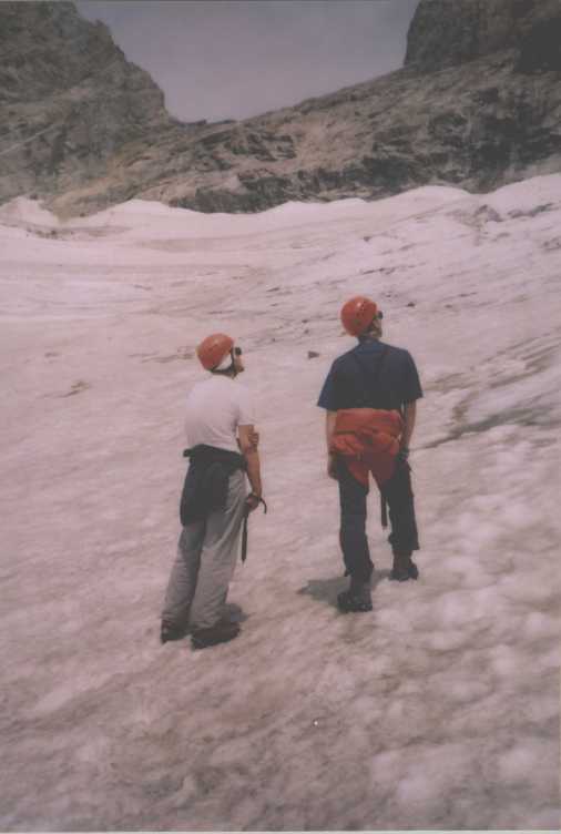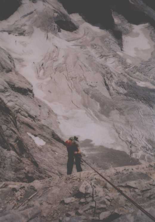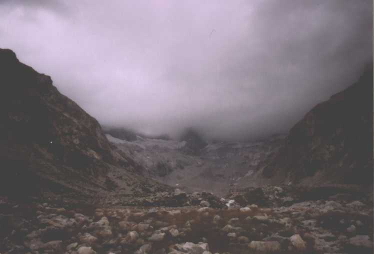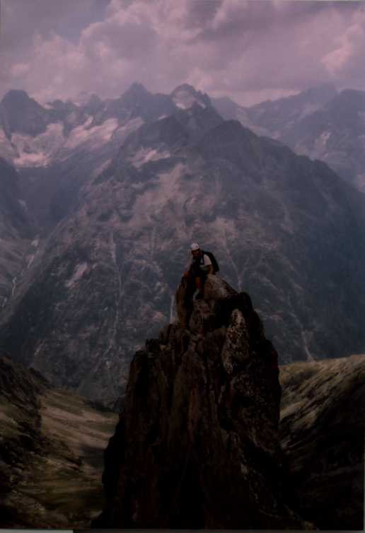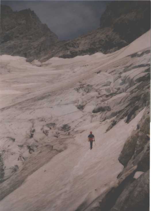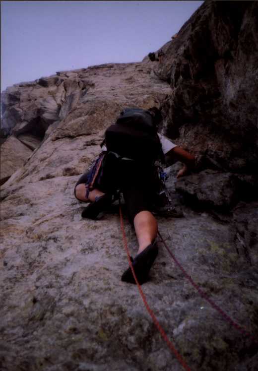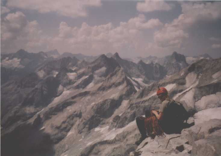 Je to neuvěřitelný, ale fakt vstáváme ve tři, lehká "snídaně", čelovky a jde se na věc. MagdaLenka má cestu celkem nastudovanou, stejně ale není tak lehký se v tý tmě orientovat. Jistit zatím není třeba, začínají nás dohánět nějaký tři lidičky, snad Španělé, docela jim to jde, ten co je vede to tady evidentně zná. Zdá se, že jsme se taky našli, lezení už ale začíná bejt vážnější a exponovaný a přirozeně mokrý. Aspoň že už je celkem světlo. Pouštíme před sebe trojičku, ten co vede se ani nejistí, jenom ty dva najednou dobírá na štandech. Zatím se asi na dvě zajímavější délky navážeme, přec jenom je to III+ a sklouznout by se dalo snadno. Konečně dolézáme k malému ledovci, který končí slušnou šluchtou. Takže mačky, no prostě bezva. Aklimatizace na Diboně byla asi dostačující, výška se moc neprojevuje, poslední úsek už je zase po skále. Těsně před vrškem opět doháníme Španěly, ještě jeden těžší kousek a jsme na vrcholu.
