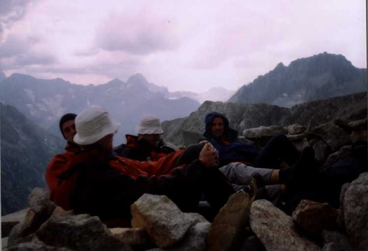 Filip a Jarda akorát odchází, cestu dali, takže spokojeni jsme všici. Bouřka pořád nikde, po necelé hodině vyrážíme taky, a deštík už nás osvěžuje. Za chvíli už je celej masív zahalenej v obrovskym mraku a je tam asi pěkný peklo. Zajímalo by mě jak jsou na tom lidi, který jsme potkali asi v půlce sestupu jak jdou nahoru.