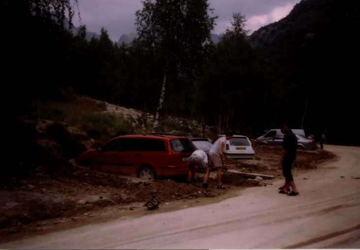 Sbírám se dost opatrně, říkám si že to nic není a že to rozchodim. Zanedlouho dohoním Janici a Vankiho, kteří celkem znepokojeně shlížejí dolů na vesnici. Chvíli nevím v čem je problém, ale pak je jasno. Parkoviště a část vesničky zasáhnul menší bahnotok a tak je Vankiho Fordka po světla pokřtěná a zavalená. Dole už nás čekají ostatní, kamenné masáži v kaňonu naštěstí utekli, Jarda teda asi celkem těsně, Filípo pak z parkoviště ujel asi dvě minuty předtím, než se tam bahínko dovalilo. Plánovaná pohodka se tedy vůbec nekoná, nějaký místní týpek nám půjčuje lopaty a tak a makáme. Vanki telefonicky domlouvá pojišťovně, aby se začla starat, ale moc se to nedaří. Moje nožka začíná slušně nabírat na objemu, MagdaLenka mi sežene něco na zchlazení, takže to jde.