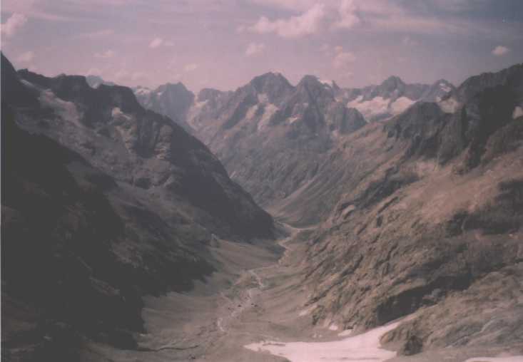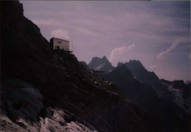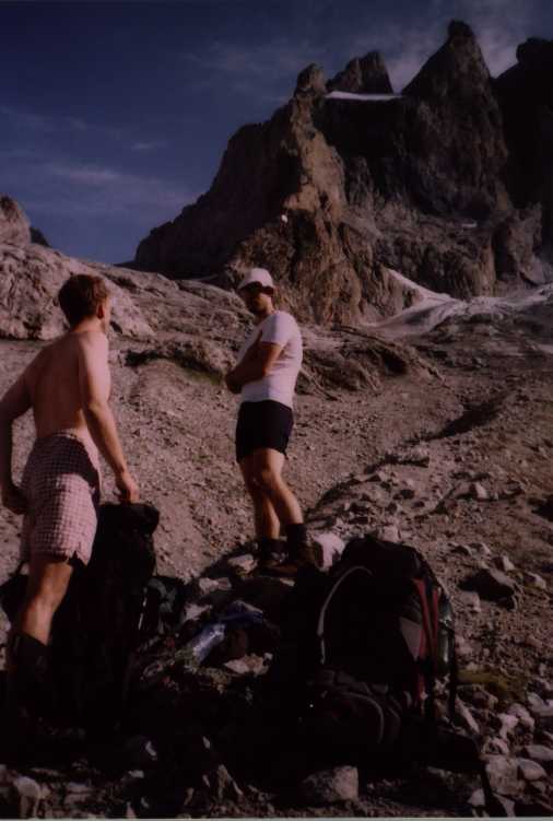 Ostatně pak slaňujeme už skoro všechno, což nás asi zdrží víc než kdybychom to sešli, ale když už tam ty štandy jsou, že jo. Konečnou fázi sestupu příliš netrefujeme a dostáváme se do žlabu, kterej vede na dolní ledovec, kam se nám vůbec nechce. Takže nakonec volíme celkem drsnej traverz. Už je snad půl pátý a bouřka nikde, ale víme že každou chvíli musí bejt tady. Zkoušim to traverznout solo, za což si pak celkem nadávám, je to tak za pět, v pohorách s kotníkem žádná slast. Snad až kolem šestý se dostáváme na chatu a nevěříme, že nám sestup trval tak dlouho.