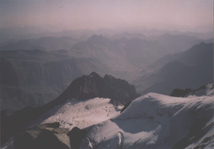 Nádhera, Alpy by měli bejt blíž. Je asi devět, takže celkem slušnej čas, užíváme si to, fotky, tatranka. Přemejšlim kde seženu 18-ti metrovej žebřík, abych se podíval do čtyř tisíc, asi smůla. Nicméně můj i MagdaLenčin výškový rekord padl, takže spokojenost. Španělé pokračují kamsi po hřebeni, my asi po půl hodině začnem se slaňováním. Není to bohužel tak rychlý jak bysme chtěli. Než se dostaneme k ledovci celkem to trvá. Ten už taky není co to bývalo, takže slaňujeme i přes něj.