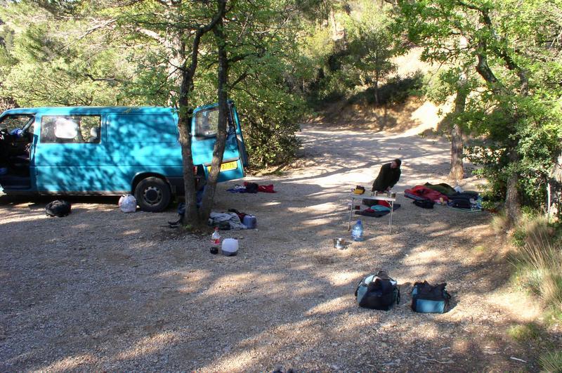 kterou nazýváme komfortní. Bydlíme na parkovišti v lesíku, nikomu to nevadí, dokonce máme jakési podivné spolunocležníky. Francouzští lezci, ve skalách je nepotkáváme,