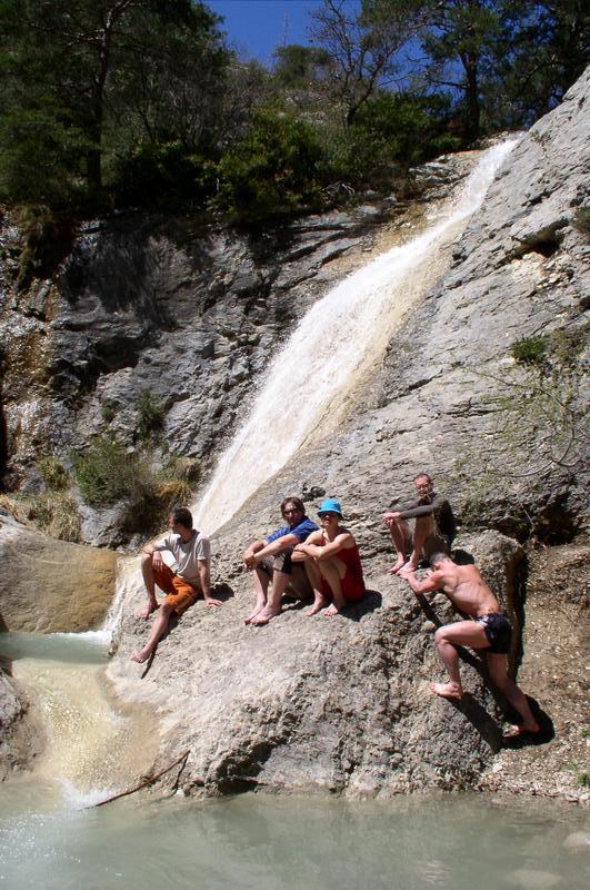 No a když je vedro nesnesitelné, je možno se přímo ve skalách ponořit do (taky nesnesitelně) ledové tůňky pod vodopádem.