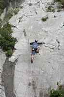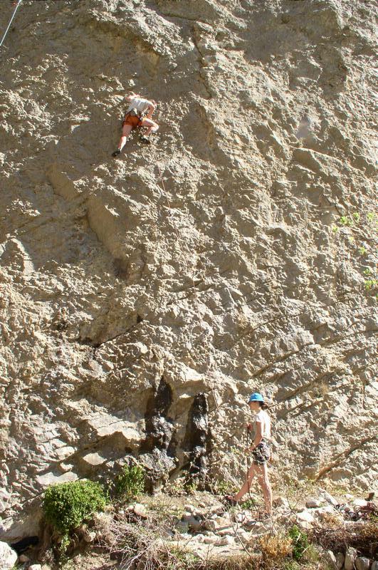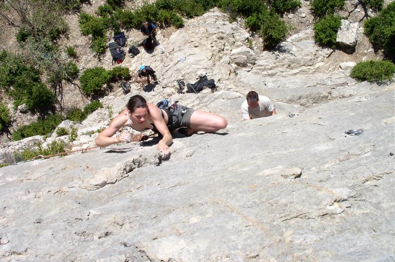 Maty bojuje v převisu cesty Amelie Melodie v sektoru Belleric (6a). Dana a Michal lezou dvě cesty těsně vedle sebe. Vlevo Le Petit Toit (6a) a vpravo Costaud Lula (6a) v sektoru Chateau