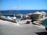 | Jediná kamínková pláž. Lezení tam jak je ta věžička co vrhá stín. | Současný přístav s hospodou |