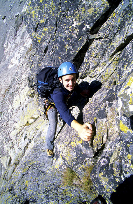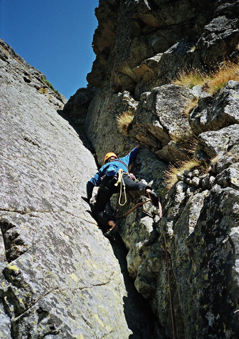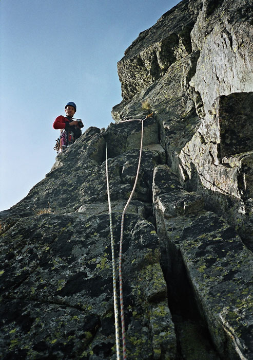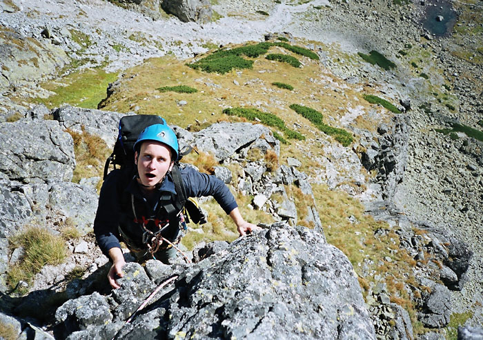 Šestý den Honza musel vylézt na Jastrabku, a protože jsme toho už měli oba plné zuby, vybrali jsme tu nejlehčí a nejkratší cestu – Severozápadní hřeben. Tady to už naštěstí po trávách nebylo, jen počasí se zhoršilo, sice svítilo sluníčko, ale vichr byl dost studený, takže se ve stínu zimomřiví jedinci bouřili(y). Naštěstí to byly jen čtyři kratší lehké délky a nahoře jsme zalezli do závětří. Duše fotografa jásala a plesala.