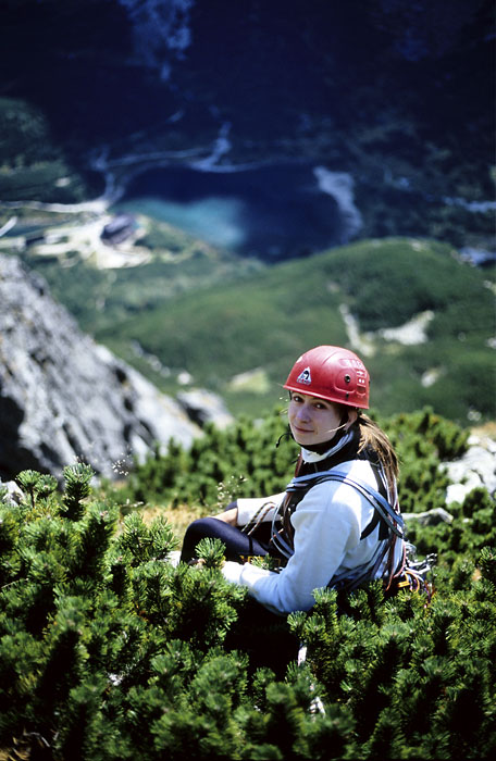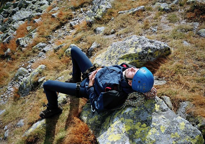 Dole v Červené dolině jsme se povalovali na trávě a akumulovali sluneční energii, ale Honzu svrběly ruce a chtěl si dát ještě jednu délku Fehéra,Lehotského, co jsme lezli včera. Nabalil si pěkně foťáky na záda, nechtěla jsem ani pomyslet na případný pád (škoda takového fotografického materiálu). Kila navíc mu však nevadily a bez problémů vybaletil k prvnímu štandu a cvakal jeden snímek za druhým.
