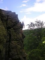 Údolní stěna dosahuje výšky 20m a vedou v ní nádherné exponované cesty od 5+ do 7-, zalezete si po lištách i spárama, někde vystačíte s presama do 4ky a 5ky počítejte s frendama a vklíněncema. Vyhněte se jižní stěně horní části(dost sračky i na mne!!!) a zabouldrujte si na menší skalce přímo u cesty(Myš), kde jsou krátké, ale pěkné výšvihy do 10m. Hlavní skála je od cesty(široká vrstevnicová šotolina, možno dojet až sem)ústyhodných 20m!