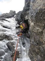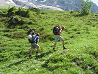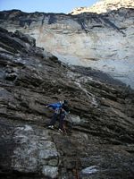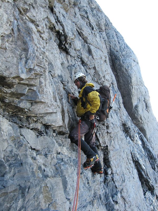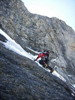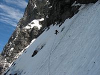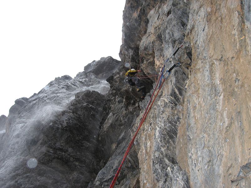 Šlapeme příkrým stoupákem pod stěnu, moderní styl nástupu zubačkou na Eigergletscher a seběhnutí pod stěnu za 15minut prostě neuznáváme. Přespíme na rozkvetlých loučkách pod stěnou, a ve 2 hodiny ráno prcháme před vzteklou liškou vzhůru. Málem mi rozkousala spacák, mrcha. Po každé těžké délce se pak utěšujeme slovy „tohle by za náma dát nemusela“, další noc snad bude klidnější :-). Spodní část stěny je položené suťoviště plné potoků, proplétáme se kudy to pustí. U těžké spáry se navazujeme, bez problémů nacházíme Hinterstoissův traverz, kluci mají dokonce i jakési topo stěny, s orientací kupodivu není větších problémů. Eisslauch je skrze vodu nelezitelný, proto je nutné ho oblézat vlevo po plotnách. Šindelovitě sklopené mokré poličky, všechny chyty na spoďáky, v mačkách tu člověk pěkně bruslí. Naštěstí Ondra, na starostlivé doporučení brigádníka Hudysportu, zvolil vhodnou obuv kategorie D! A hlavně ho tedy napadlo sundat si mačky. Délku vydrtil, dobrá práce. Druhé ledové (sněhové) pole je v pohodě, a již nabíhám do žehličky. Nepříjemným koutkem teče spousta vody, řádně provlhám. Nějak mi vůbec neschne bunda, uvědomuju si na štandu, divný. Otočím se a mám jasno, je zataženo a drobně prší. Sakra jak to, má být 5 dní krásně, asi nějaká lokální oblačnost nad Alpama, to je smůla. V další dýlce už hřmí jako blázen, začínají padat kroupy… no prima. Naštěstí již brzy dorážíme do pohostinného „bivaku smrti“, převislá stěna kroupy i déšť odcloňuje, nezbývá než zvolat: „tady je to boží!“ Kopeme plošinky, zalézáme do ždáráků a igelitových pytlů, (co kdo má :-)) a je nám fajn. Bouřky neustávají celou noc, ba ani dopoledne. Nějaká vytrvalá lokální oblačnost! Odpoledne se rozhodujeme dolézt aspoň do bivaku na Rampě, protože jinak bychom tu taky mohli strávit tejden. Na Rampě sice žádný bivak nenacházíme, zato vodopád ve Wasserfallkaminu, radost pohledět. Leda tak se šnorchlem. Volíme tedy objížďku zprava, hodně přísná Terraryho varianta, Ondra opět fajnově zabojoval a zafixoval lano na zítřejší start. Bivak v sedě je nakonec docela příjemný, hlavně že je z čeho si dělat legraci.