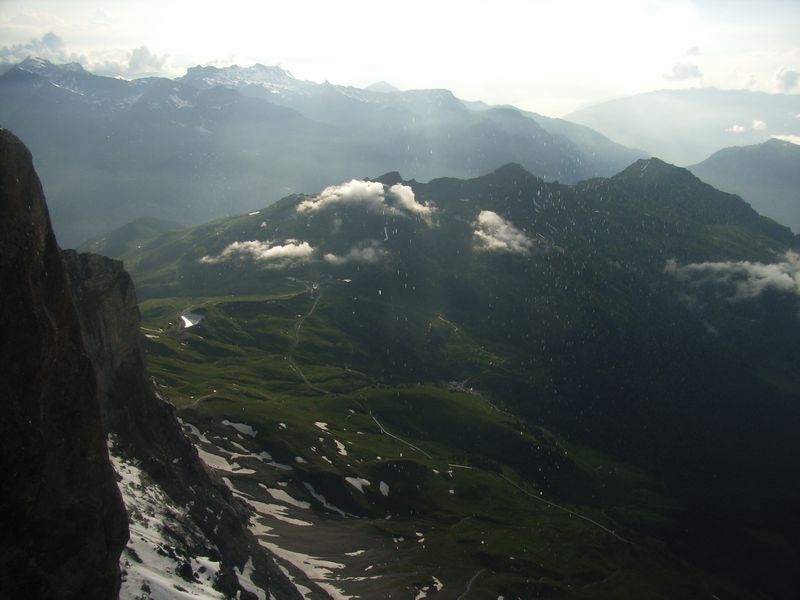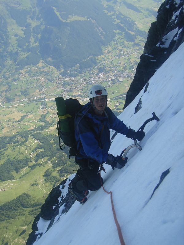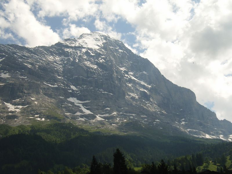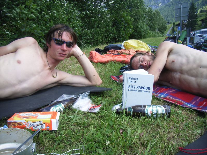 Ondrův parťák Jíra je dle očekávání obrovskej pohodář, takže už když pozoruju jejich styl nákupu jídla v Normě 5 minut před a 15 po zavíračce, je mi jasné, že se bude jednat o velmi veselý zájezd. Do Grindelwaldu, který pochopitelně familierně nazývám „Grünwald“, dorážíme klasicky v noci. Trochu pospíme a ráno máme před sebou stěnu v celé své kráse. Opravdu nádherný pohled, na stěnu stěn, opředenou bájemi a tragédiemi při pokusech o první průstup, stěnu o které byly svého času napsány stohy knih (doporučit lze např. knihu Bílý Pavouk od H. Harrera). Než stačíme přebalit batohy, přikluše na parkoviště 68letý amík se slovy „climbing is not fun, not a pleasure!“. Všude vodopády, zabalili to u okna zubačky. Hm hm, alespoň nám věnovali parkovací lístek na několik dní :-)