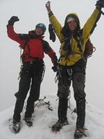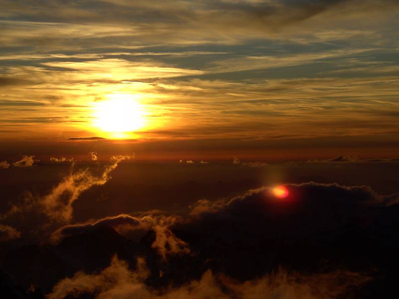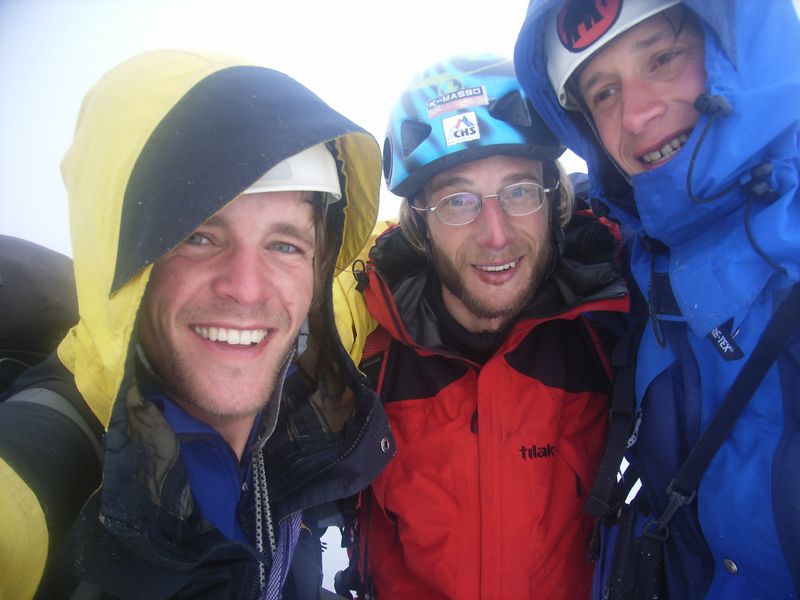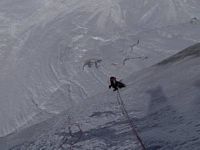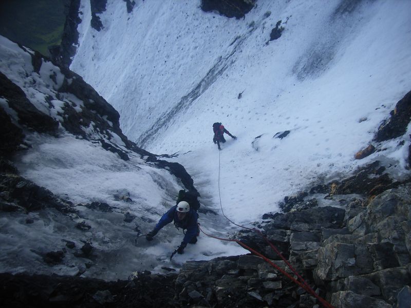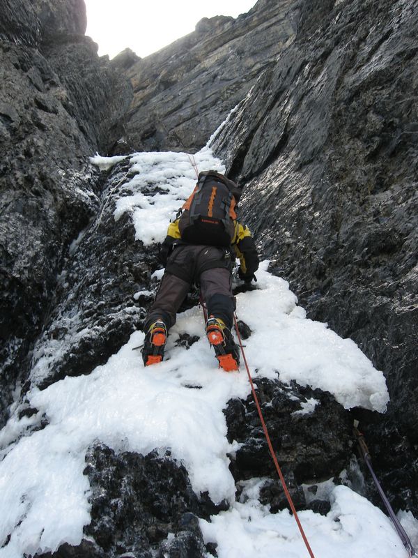 Ve čtyři ráno začnou zpívat ptáci, a my prusíkujeme vzhůru. Se zájmem pozoruju kluky válčit pěknou dobu, hm, asi jsem jim měl poradit pár triků, kam si Vágus věší batoh a tak podobně, tak příště. Ondra to dobojuje k Božskému traverzu, a dál je zas kus na mě. Sníh, v Pavoukovi začíná držet led, valíme co nejrychleji hlava nehlava. Výstupové spáry, traverz ke Cortiho bivaku málem míjím, začíná sem svítit slunce tak rychle dokud sníh ještě drží, absolutní dávačka lehkým rozporem vysněženými komíny, jako by měl člověk křídla. Tohle že byly obávané Výstupové komíny? Tak to už jsme skoro nahoře. Brzdí nás jen další bouřka, a Ondra, odmítající lézt po vrcholovém hřebeni se stojícíma vlasama při bzukotu cepínů :-). Půl hodiny čekáme při vysmáté konverzaci, a ve čtyři jsme na vrcholu. Dnes tedy pěkná práce!