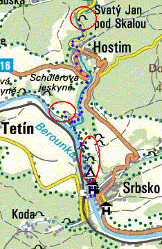 Dobřichovice, Karlštejn do Srbska, kde lze pohodlně zaparkovat třeba u penzionu Berounka. Odtud pokračujeme pěšky