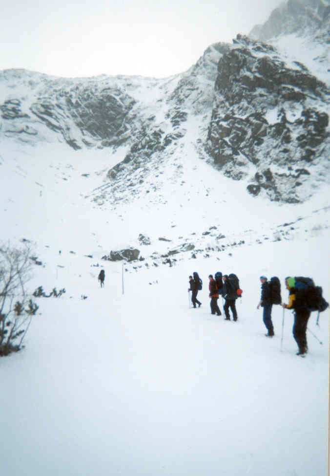 Třetí den se naše skupina pokusila přejít Barani Rohy - to se však nezdařilo a tak alespoň se klukům podařilo přelézt cestu, co lezl den před nimi Špicál a spol.. Špicál a spol. vyrazili někam do Javorové doliny na ledy. Poslední skupina pod vedením Pižďucha a Petry Z. (8 členů-včetně 3 slečen) se rozhodla pro výstup na Malý Ledový štít hřebenem, přes Finovu kopu. Když nebyli v 19,00 u večeře, lehce jsme znervózněli, když nedorazili do 20,30, poslali jsme pátrací skupiny pod Sedélko a na Finiovu kopu. Skupiny měly limit 1 h a zákaz vystoupat až na Sedélko. Není se proto čemu divit, že byly neúspěšné. Miro vyburcoval horskou službu a my jen s úzkostí čekali. Počasí venku přituhlo a pořád sněžilo. Nelze popsat radost, když jsem v 2,30 uslyšel z jídelny dívčí smích. Vrátili se všichni, živí a zdraví, sice vyčerpaní, ale vrátili se. Problém byl jednoduchej, cesta jim v tomto počtu pro řadu míst, které bylo nutno jistit, trvala trochu déle. Při sestupu pak omylem sešli do Javorové doliny. Pak už jen hledali Sedélko, podařilo se jim to asi až na po páté, sice pozdě ale přece!