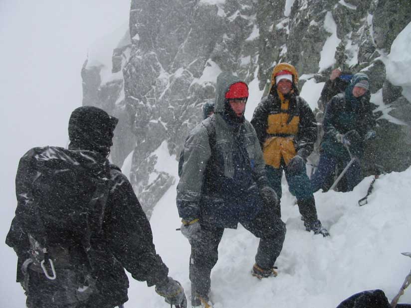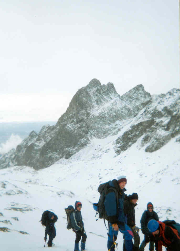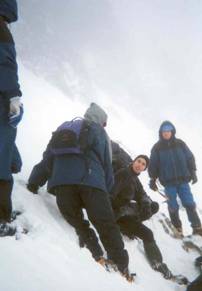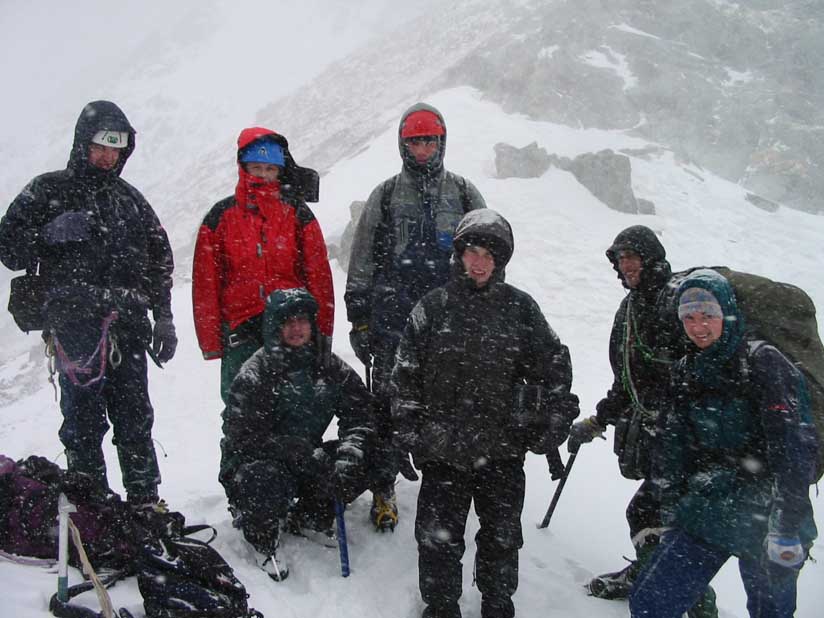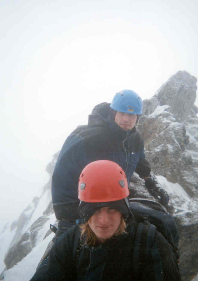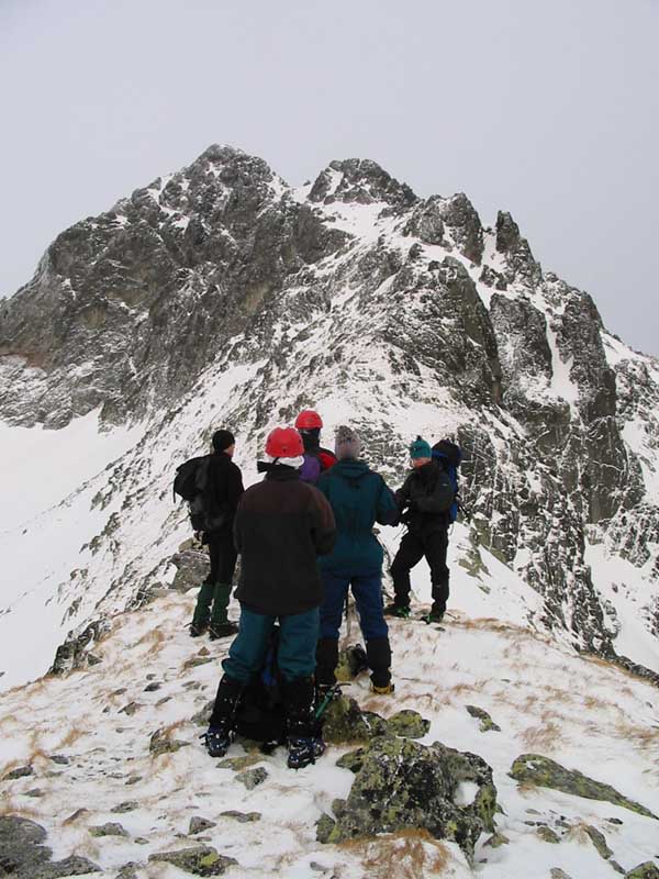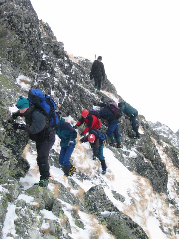naše vrcholová skupinka (4 lidi), jež po překonání dalších obtížných míst dorazila vrcholu a i zdárně po hřebeni