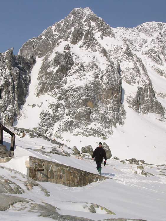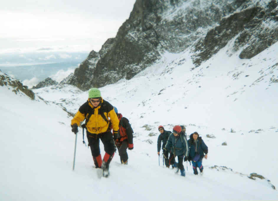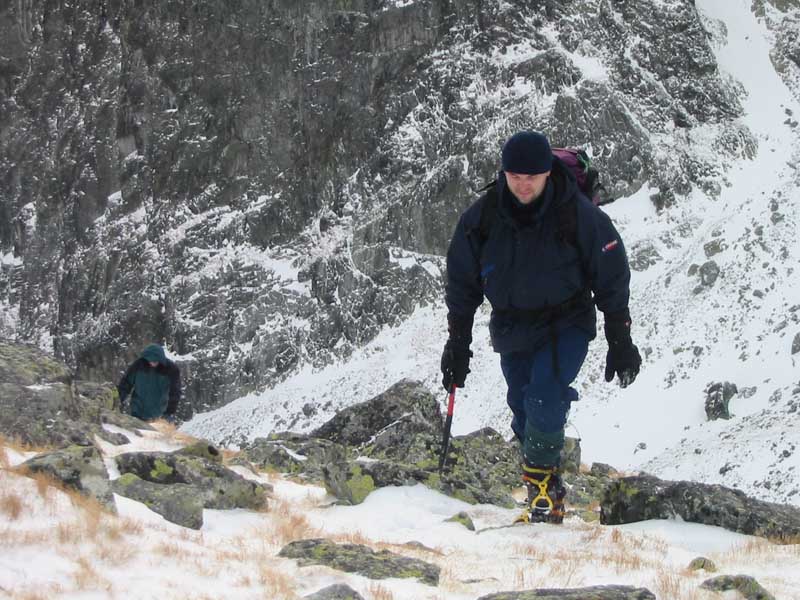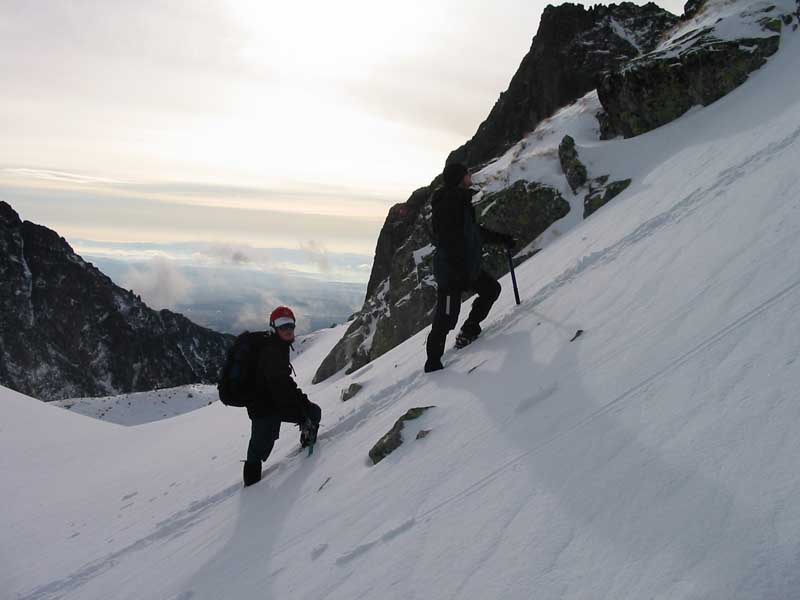 Poté, co se nám podařilo vyškrábat se k Teryně, rozhodovali jsme se, kam vyrazíme. Část vyrazila K Mačaci veži, já se nechal zlákat Láďou Pokorným k výstupu na Žlutou stěnu cestou Korosadowic. Za chvíli jsme byli pod nástupem, nutno podotknout, že bylo asi tak 13,30. Stav cesty vyžadoval nazutí maček atd., Po zdolání 3 lanových délek, jsme se octli pod vrcholovým traversem, pár metrů před koncem cesty, mělo to však jednu velkou vadu,