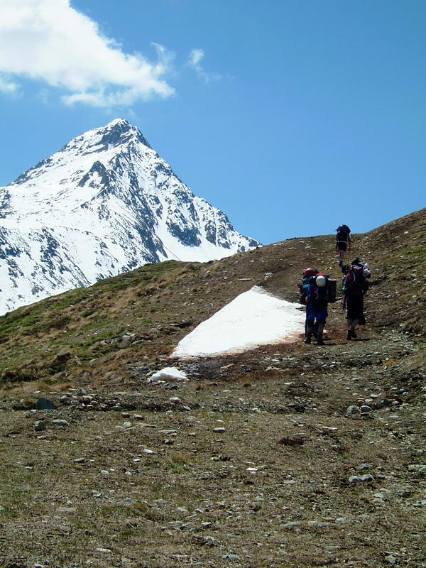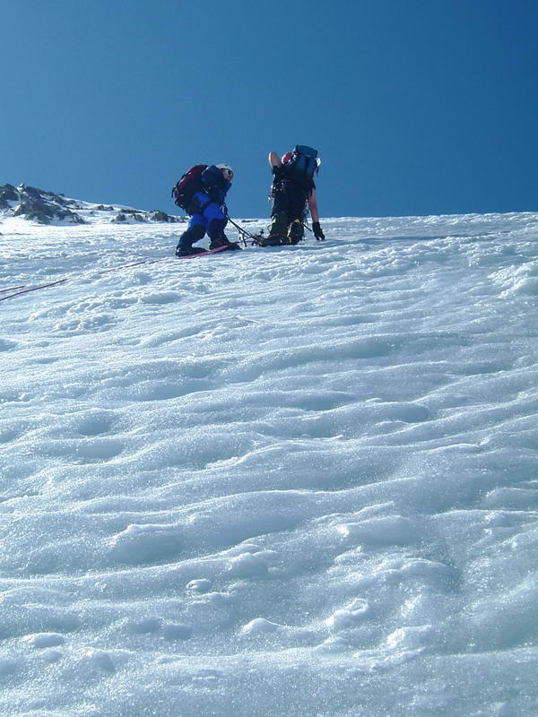 Ráno ve 3 nás nemilosrdně budí budíky a něco po půl čtvté vyrážíme. Venkovní teplota (proti očekávání dost vysoká) nám dává najevo, že nástup nebude zadarmo. Na začátku jdeme po kamení a vrstvě sněhu, která stačila v noci jakž takž ztuhnout(o zmrznutí se nedá mluvit ;). Sníh rychle měkne a začínáme se slušně bořit - občas jenom po koleno, často hlouběji. Chudák Alf je z nás nejtěžší, takže zapadává nejvíc a důkladně si to užívá. Úsek cesty před sedlem Mittelkarjoch si užíváme všichni a chůze po čtyřech je jedinou taktikou na to, aby člověk zapadnul jenom každých několik kroků. Po zdolání psychicky i fyzicky nejnáročnějšího úseku do sedla vyrážíme na ledovec. Obejdeme dva hřebínky nad trhlinami a konečne se nám ukazuje naše stěna. Zastavujeme se a fotíme, když v tom odjíždí Růžův obal od foťáku vstříc nejbližší trhlině, kam i přes záchranné pokusy zahučí. Později nám Růža prozradil, že ráno do toho obalu cpal klíče od auta, ale nějak se mu tam nevešly a nakonec je dal do batohu. :-) Pak funíme nekonečným svahem k vytoužené a stále stejně vzdálené stěně. Průvodce uvádí nástup z chaty 3 hodiny, nám to trvalo asi 5 a půl, což trochu vypovídá o podmínkách, které vládly(zas tak špatnou fyzičku nemáme ;).