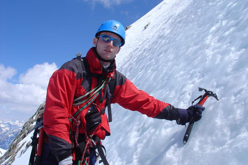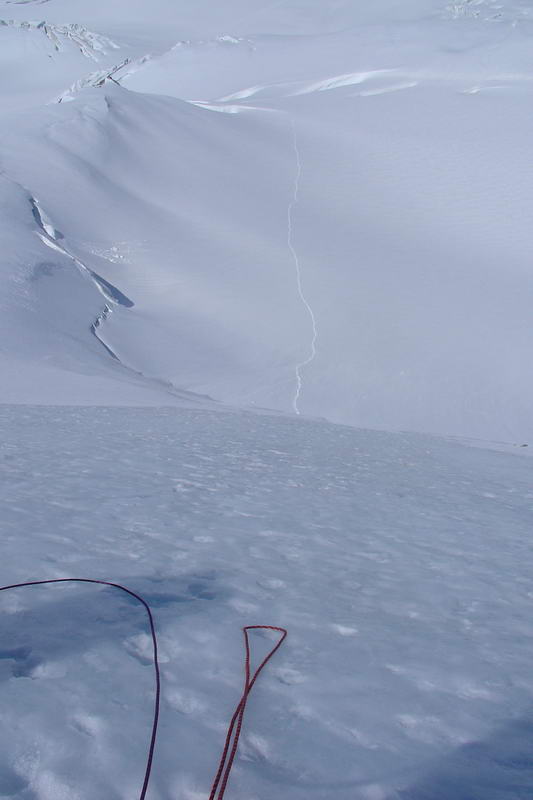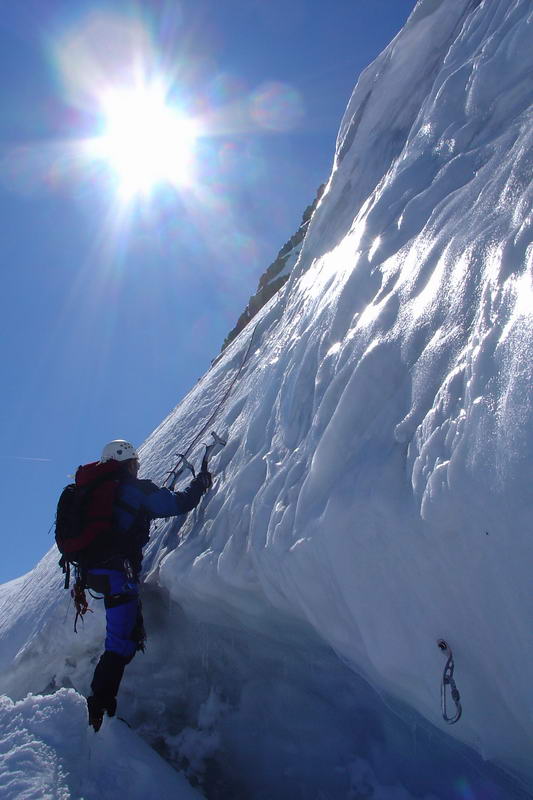Krátce po 9 hodině vyrážíme s Čuldou do stěny shybem na cepech. Kromě krátkého úseku firnu je celá stěna
