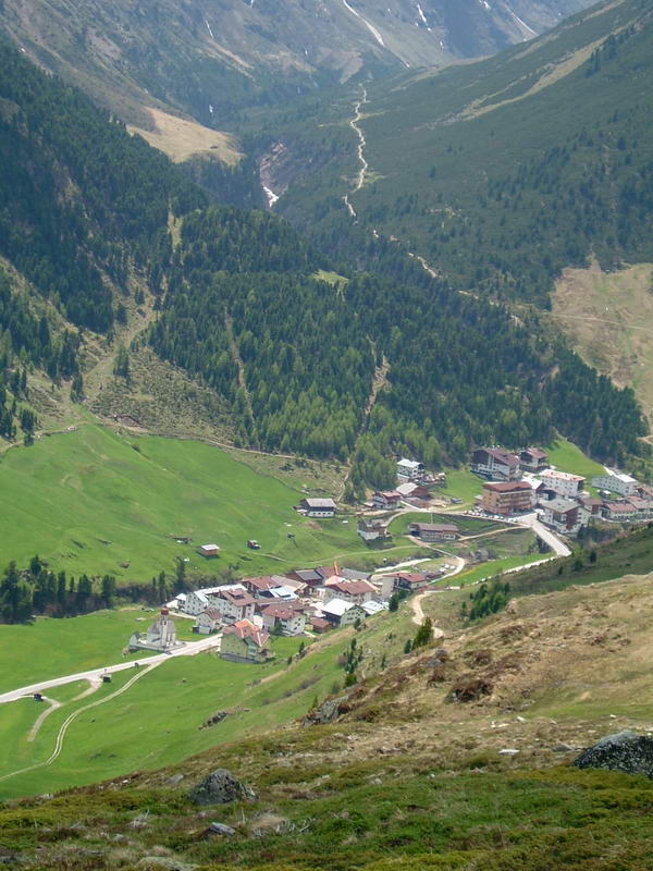 Krátce před polednem nás krásným počasím přivítal tirolský Vent, odkud budeme muset přepnout pohon z koňských sil na síly volské.